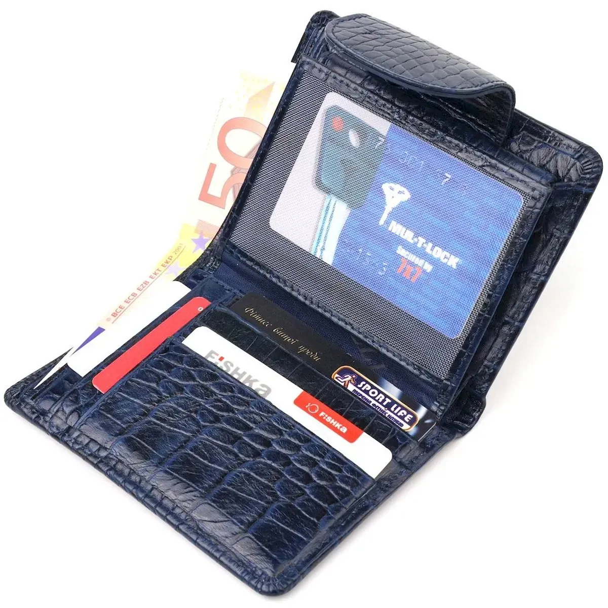 Жіночий модний гаманець компактного розміру з натуральної шкіри, з тисненням під крокодила. Аксесуар має відділення для купюр з перегородкою, монетницю, що закривається клапаном на кнопку, приховану кишеню та сім відсіків для карток, два з них під сіточкою. Закривається аксесуар у дві додавання хлястиком на кнопку. Якісний шкіряний аксесуар завжди вважався показником смаку та достатку, саме такі вироби представлені у нашому магазині, у нас кожен знайде щось для себе.