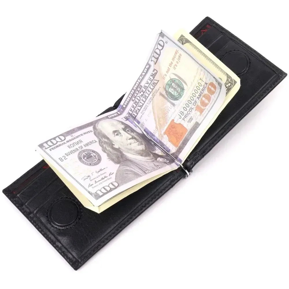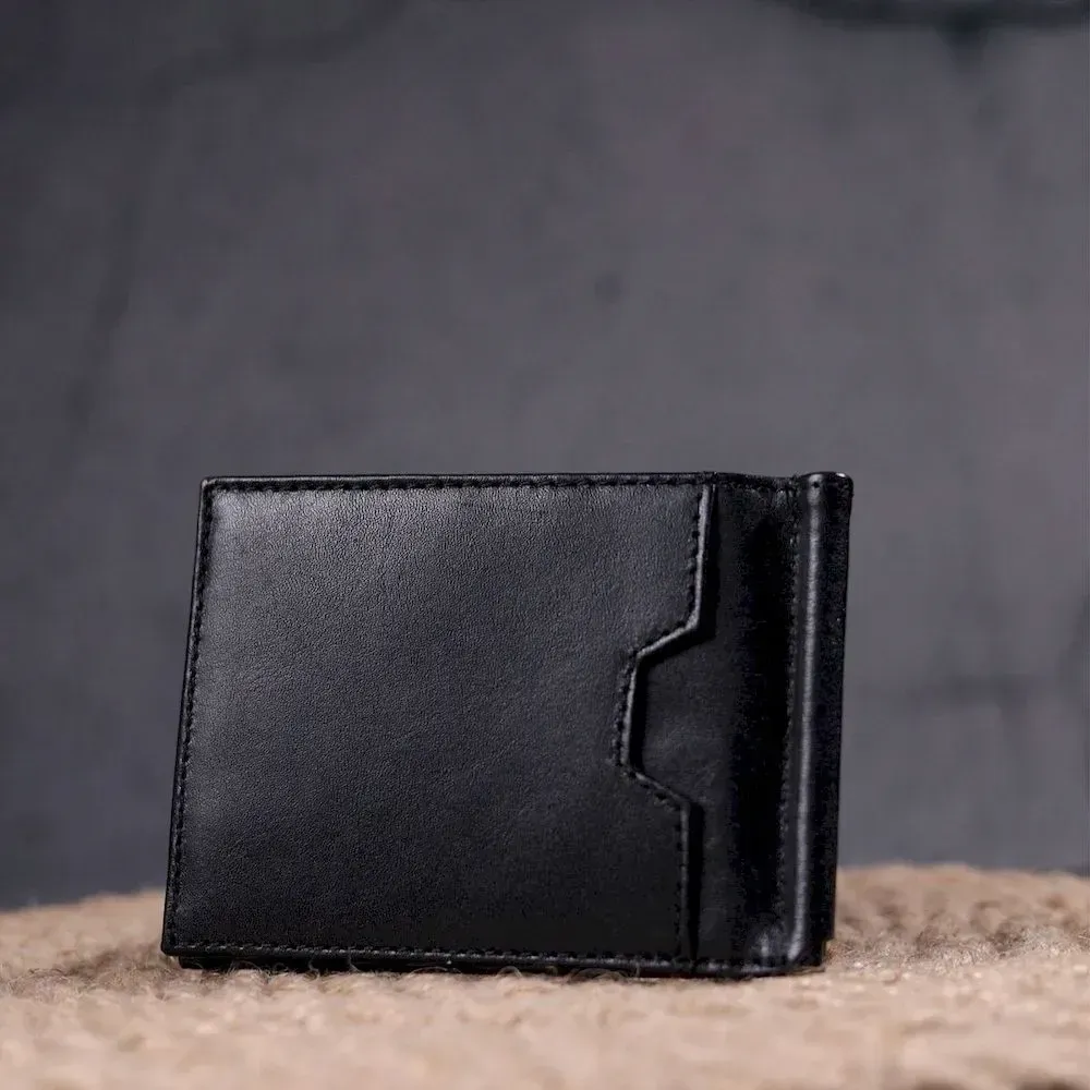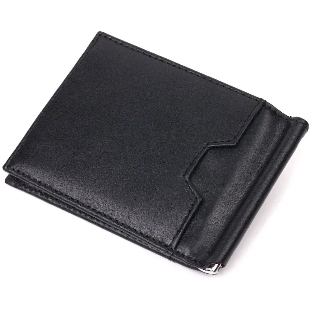 Стильний чоловічий затискач з натуральної гладкої шкіри, у класичному чорному кольорі. Виріб закривається у два складання на магніт. На лицьовій стороні у вигляді декору розташований логотип виробника, а також для декору краю затискача прошиті чорною ниткою. Аксесуар упакований у фірмову коробочку. Вироби з натуральної шкіри завжди будуть чудовим подарунком для близької людини.