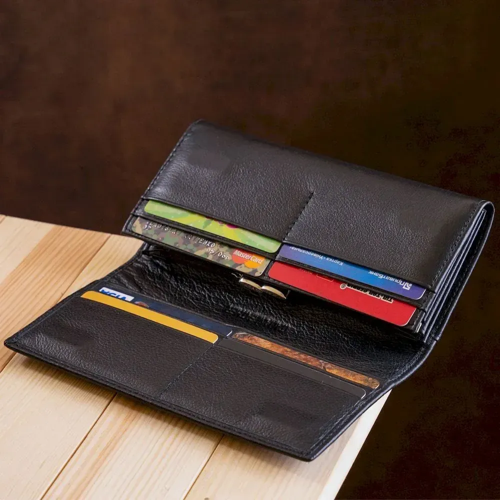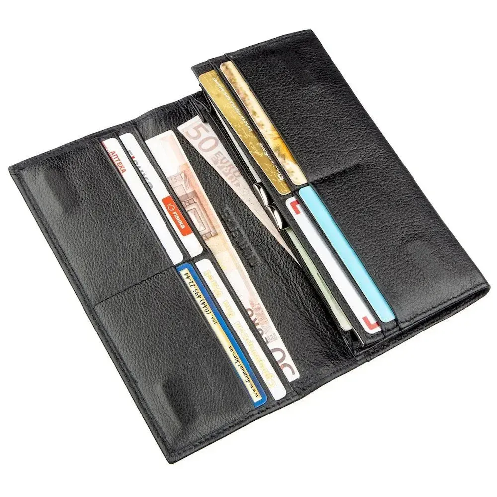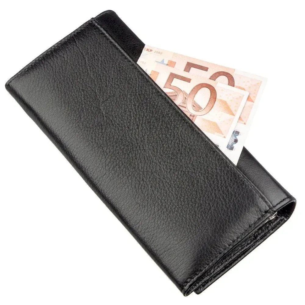 Класичний гаманець для ділових і впевнених у собі жінок. Колір – насичено чорний. Матеріал виконання – високоякісна натуральна шкіра із зернистою фактурою. Виглядає дуже багато і розкішно. Наповнення гаманця досить практичне та функціональне. У ньому є різні відділення та кишені для купюр, карток, дрібниць та інших цінностей. На зовнішній стороні розташоване одне потаємне відділення на всю довжину гаманця. Закривається аксесуар на зручні магніти, це легко можна зробити лише в один дотик. При покупці цей виріб буде упакований у щільну картонну коробку з фірмовим логотипом.