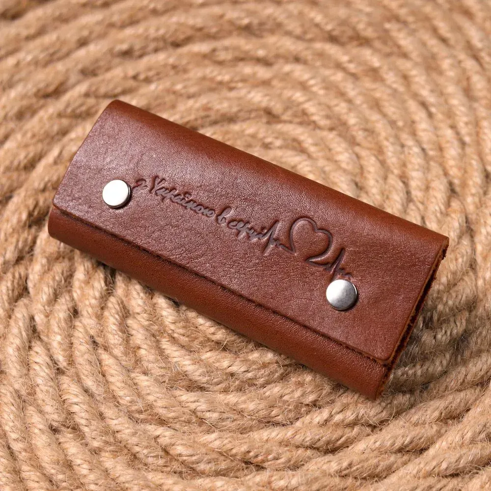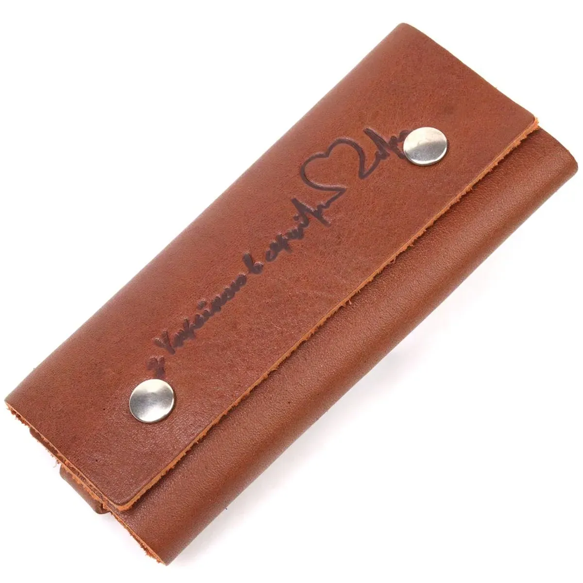 Надійна шкіряна ключниця на кнопках, з патріотичним тисненням на лицьовій стороні. В аксесуарі використано надійну фурнітуру, кольори срібла. Вироби зі шкіри завжди вважалися відмінним подарунком, незалежно від статі та віку.