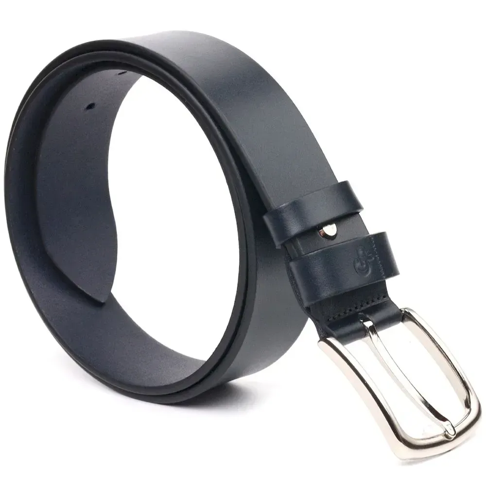 Чудовий ремінь під джинси, синього кольору з натуральної італійської шкіри, від українського виробника. Хороший ремінь здатний ідеально завершити образ та підкреслити ваш статус. Ремінь виготовлений із цілісного полотна шкіри. Аксесуар має гладку фактуру, акуратно пошитий, довжина регулюється у менший бік. Доповнено ремінець сріблястою пряжкою із закругленими кутами. Шкіряний ремінець один із найвдаліших і потрібних подарунків для будь-якого чоловіка.
