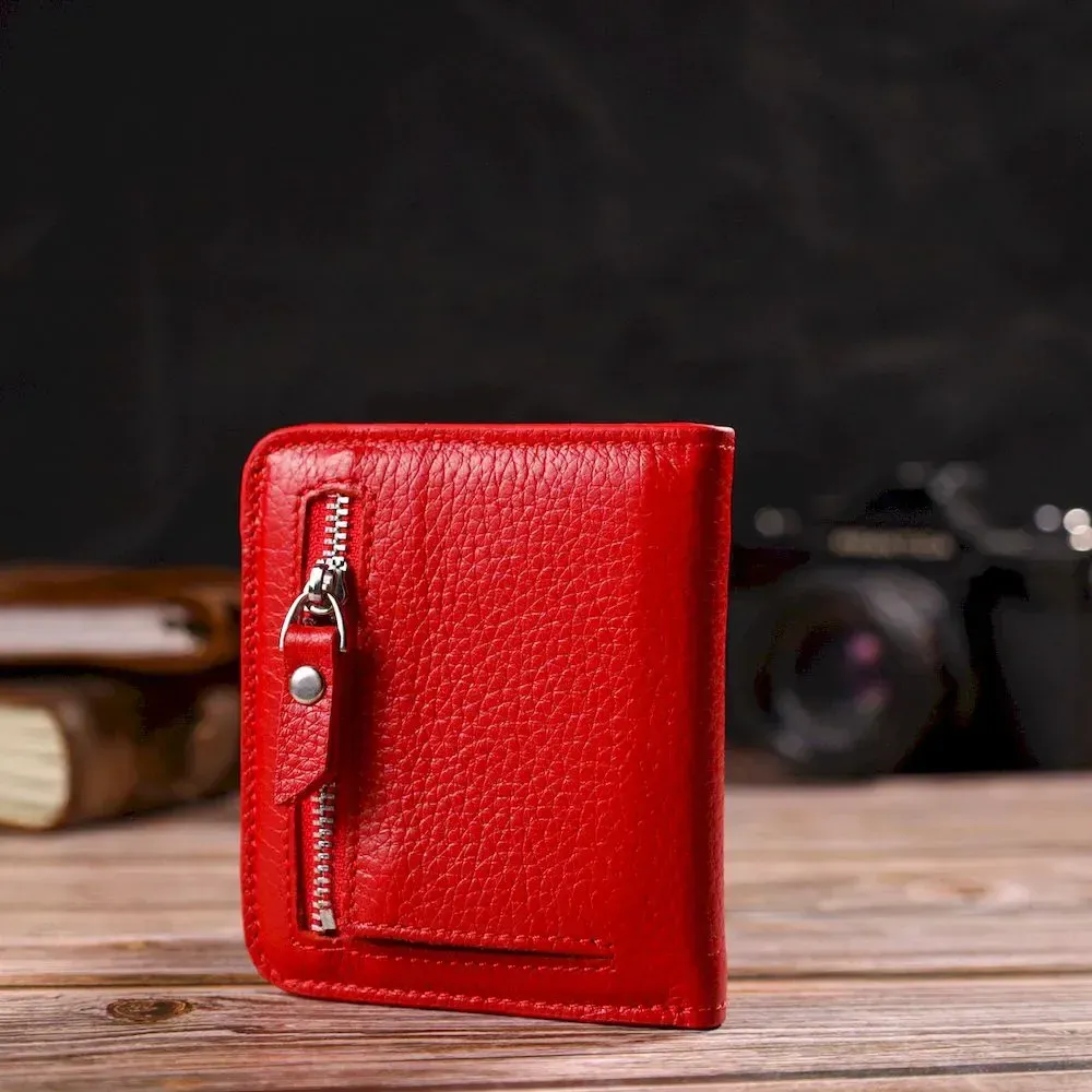 Практичний компактний гаманець з натуральної зернистої шкіри, у червоному кольорі, для суперстильних дівчат та жінок . Аксесуар має одне основне відділення з тканинною перегородкою в яке поміщаються купюри всіх номіналів, п'ять кишень для карток (одна під сіточкою), дві приховані кишені та монетницю. Закривається аксесуар навпіл на кнопку. На лицьовій стороні, вгорі посередині металевий логотип компанії виробника. Купуючи шкіряний аксесуар цієї фірми, собі або на подарунок, будьте певні, що він прослужить Вам не один рік.