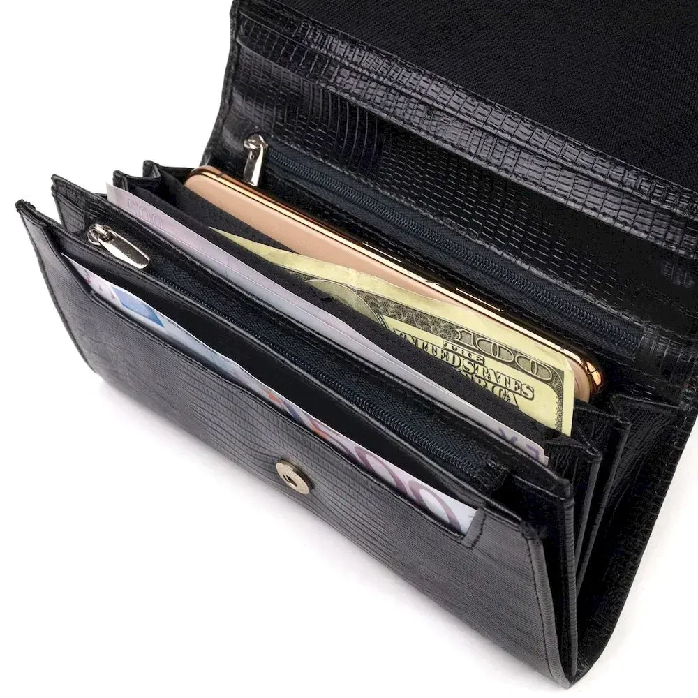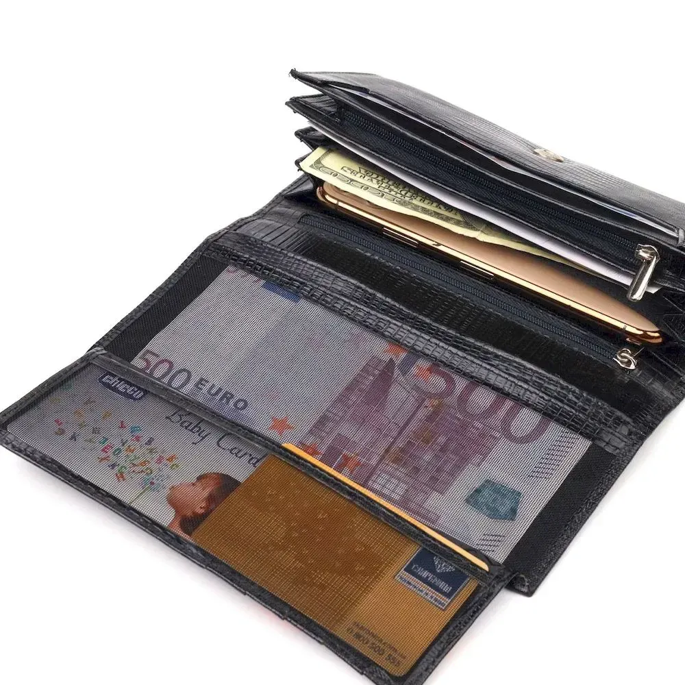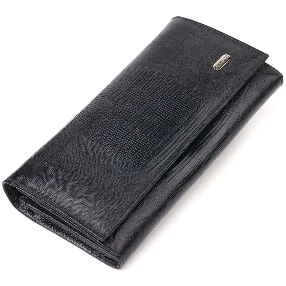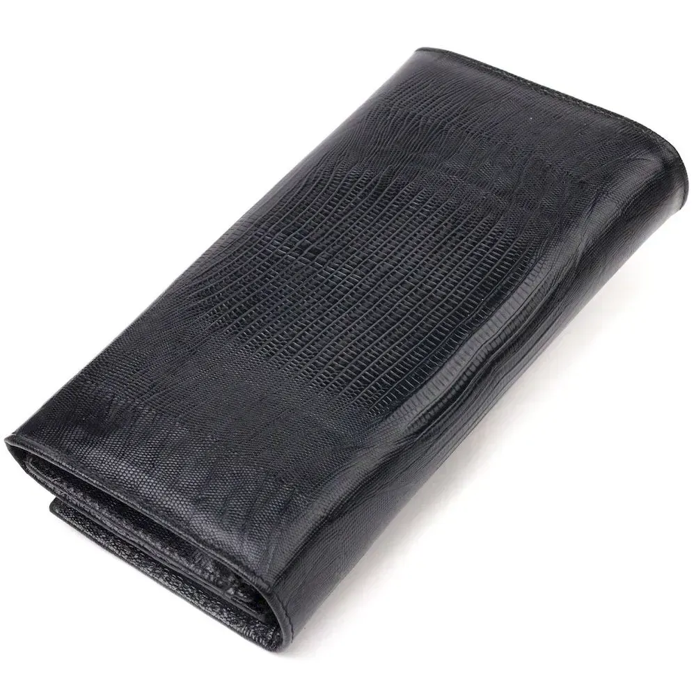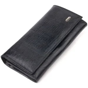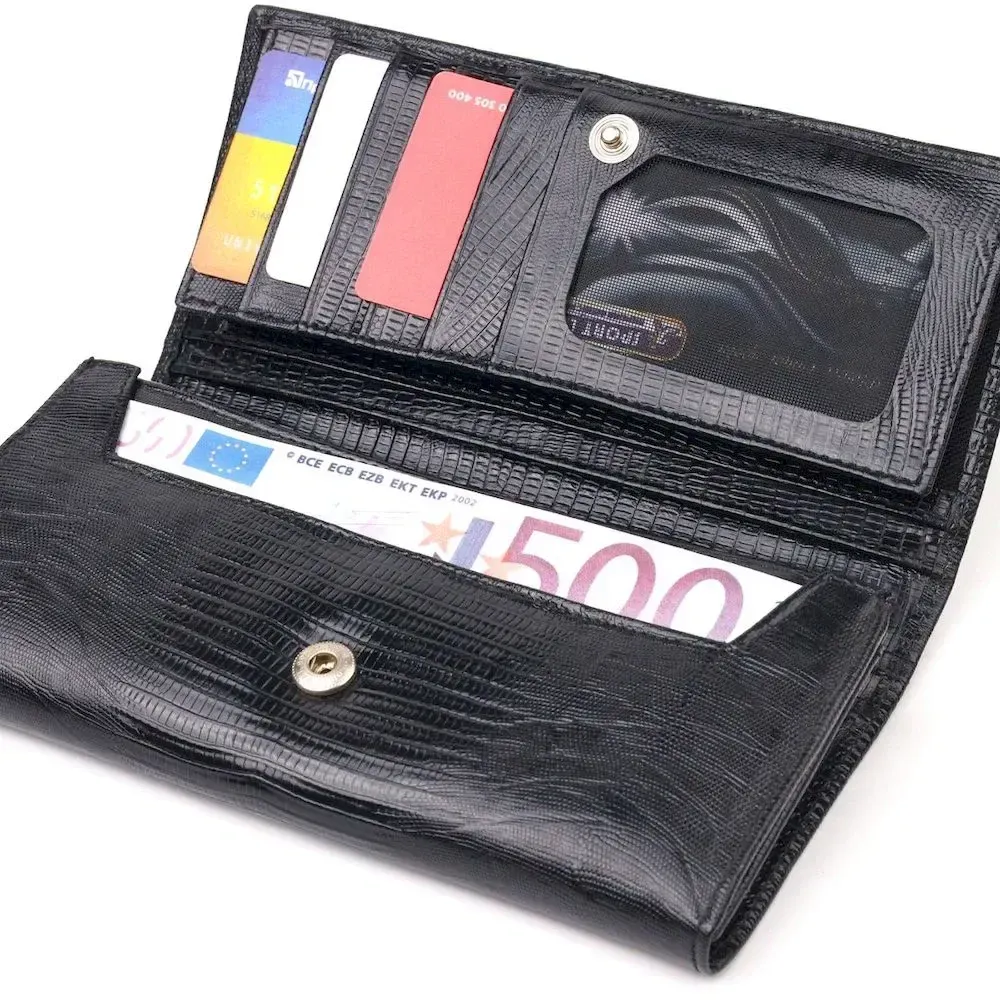 Місткий горизонтальний жіночий гаманець, із фактурної натуральної шкіри, з тисненням під рептилію. Аксесуар має три великі кишені для купюр, три прилеглі кишені, вісім осередків для карток, три з них під сіточкою, монетницю на блискавці. Виріб закривається клапаном на кнопку. Відмінна ідея для подарунка, яка не залишить байдужою жодну жінку.