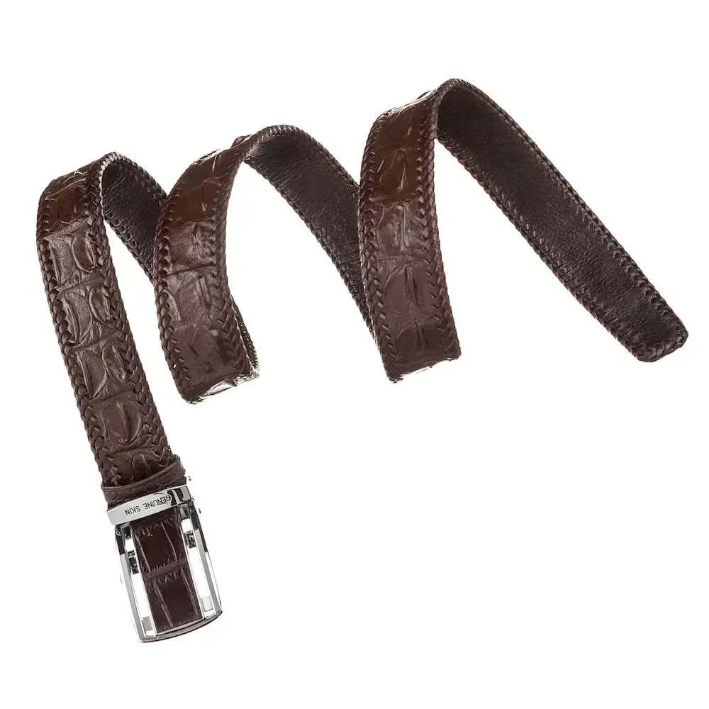 Стильний ремінь із натуральної шкіри крокодила. Аксесуар виготовлений на основі з гладкої телячої шкіри, як додаткове оздоблення по зовнішньому краю аксесуара зроблено обплетення з гладкої шкіри під колір ременя. Виріб обладнано знімною автоматичною пряжкою, яка декорована вставкою, з натуральної шкіри крокодила. Вироби зі шкіри крокодила завжди вважалися великою розкішшю, оскільки у світі не так багато компаній, які займаються виробленням такої шкіри, оскільки цей процес дійсно надзвичайно трудомісткий. Ідеальний подарунок для людей, які люблять все дороге та якісне. Ремінь універсальний, його можна носити як під джинси, так і під штани. Кожне полотно має унікальний візерунок, що не повторюється, тому, купуючи ремінь зі шкіри крокодила, ви можете бути повністю впевнені в тому, що другого такого ременя немає в природі.