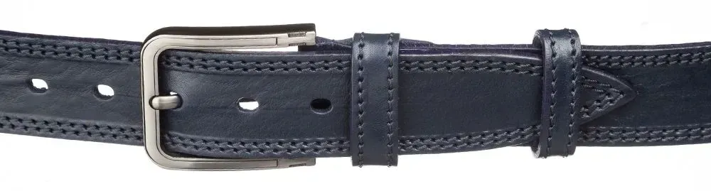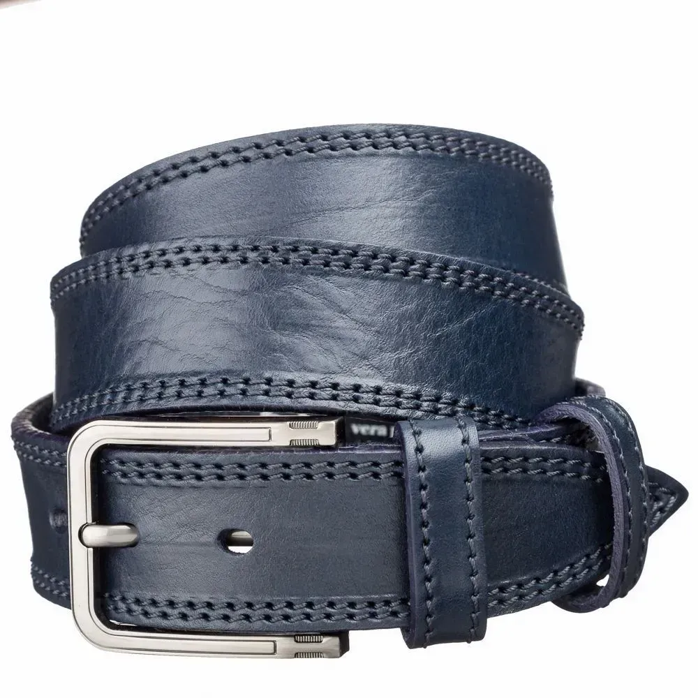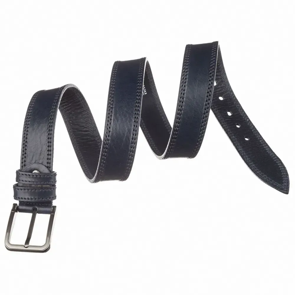 Оригінальний чоловічий джинсовий ремінь із натуральної високоякісної шкіри. Аксесуар прошитий подвійним рядком, що надає йому оригінальності. Колір фурнітури: срібло. Виріб упакований у гарну коробочку. Шкіряний ремінь є відмінним рішенням для подарунка чоловікові до будь-якого свята.