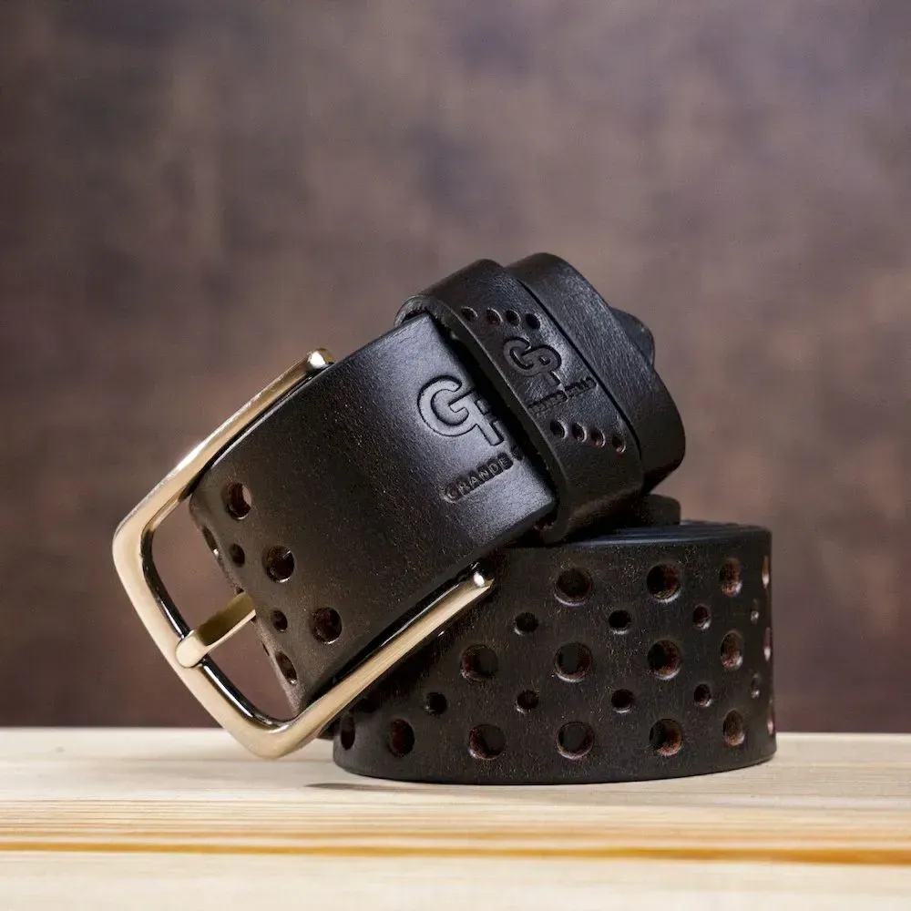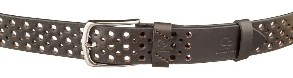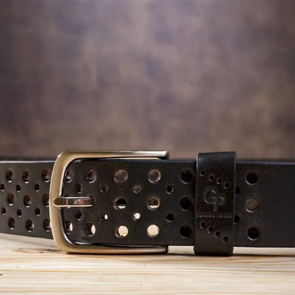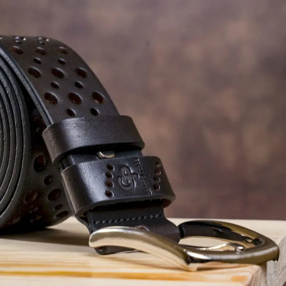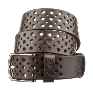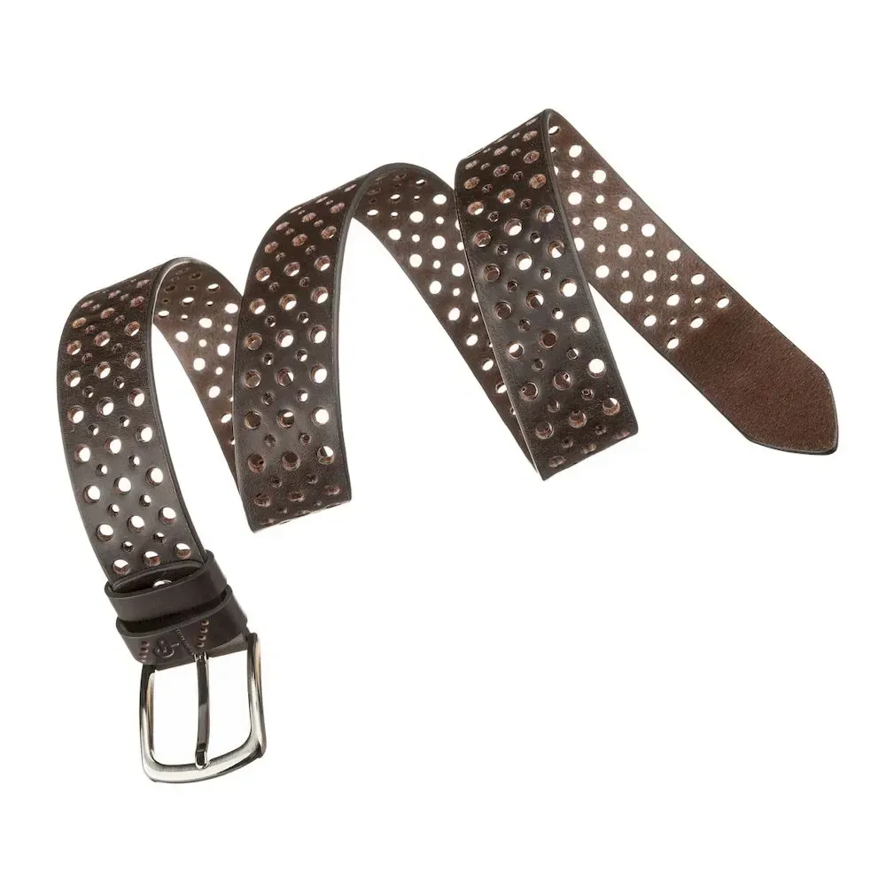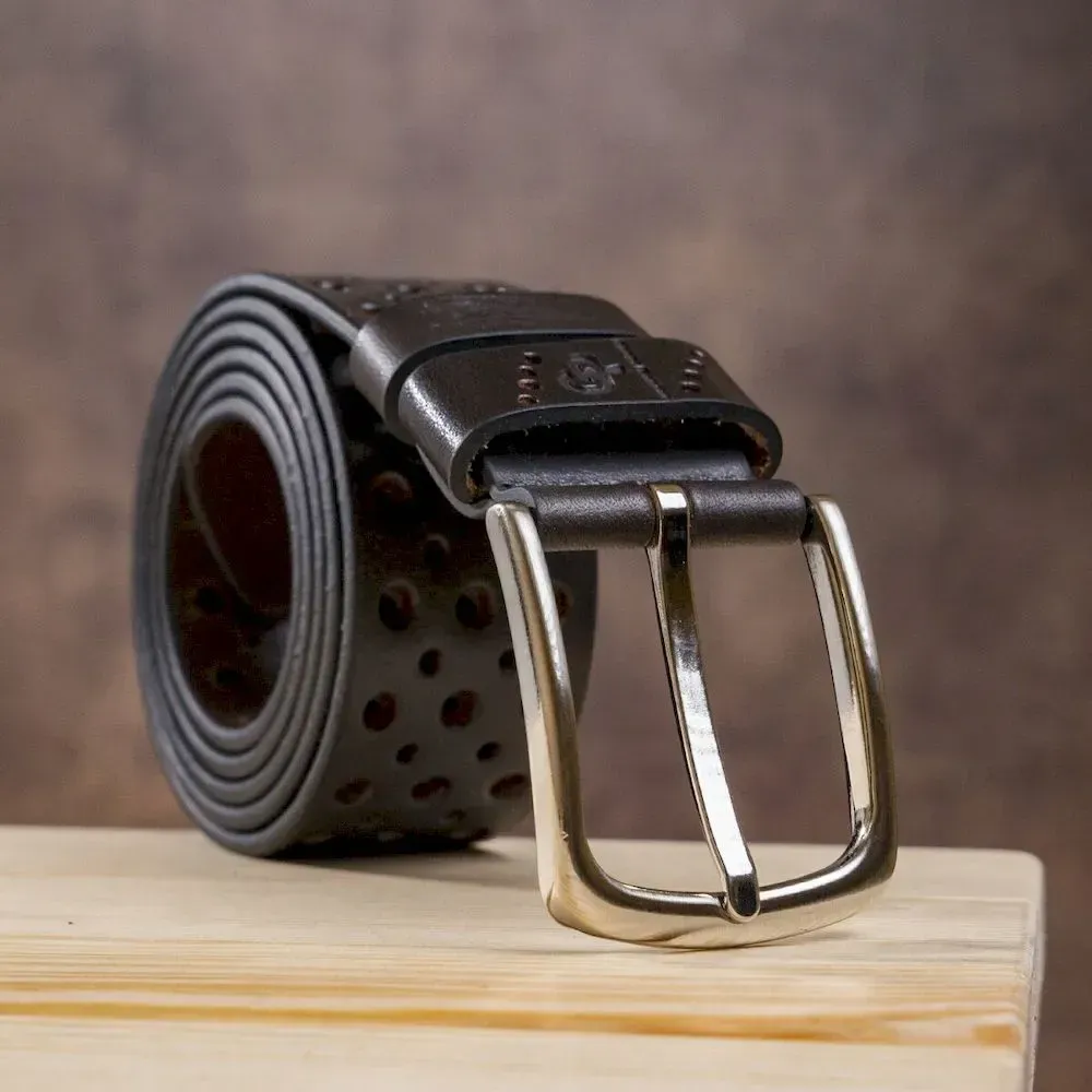 Стильний коричневий ремінь із цілісної італійської шкіри, модель підійде як чоловікам, так і жінкам. Незвичайне полотно перфороване отворами різних діаметрів, що надає виробу вишуканості та неповторності. Виробник використовує виключно імпортну фурнітуру, яка не темніє, не дряпається і не викликає алергії.