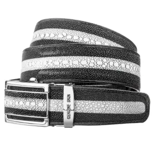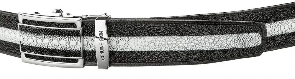 Розкішний ремінь з натуральної шкіри морського ската, крупнозернистої, пружної та приємної на дотик. Пряжка автоматична, виконана з якісної фурнітури, дуже акуратна і стильна, колір пряжки: срібло зі вставкою зі шкіри ската. По центру ременя візерунок біла смуга нагадує великі бусинки. Кожна шкірка ската має унікальний візерунок, тому купуючи ремінь зі шкіри ската, ви можете бути повністю впевнені в тому, що другого такого ременя зі шкіри ската немає в природі. Такий ремінь підкреслить ваш статус та почуття смаку. Може бути чудовим подарунком для близької людини.