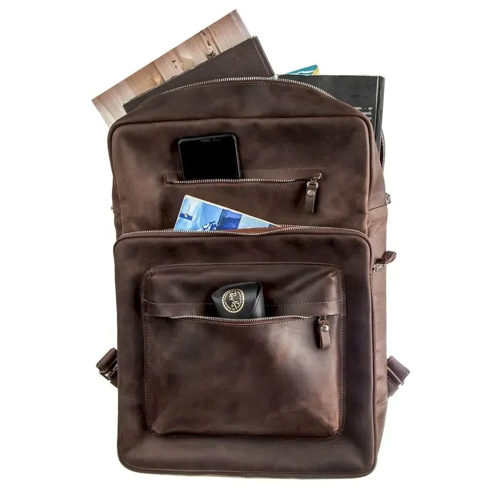Дуже місткий шкіряний рюкзак нікого не залишить байдужим. Новинка від українського бренду. Виконано модель у вінтажній шкірі, яку так люблять наші клієнти. У рюкзаку є ущільнена кишеня, в яку ви легко помістите планшет або ноутбук. Рюкзак ідеально поєднується зі стилем кежуал і стане просто знахідкою для будь-якого чоловіка. Якщо ви шукали якісний рюкзак для поїздок - рекомендуємо вам цю модель. У комплекті до рюкзака йде текстильний чохол.
