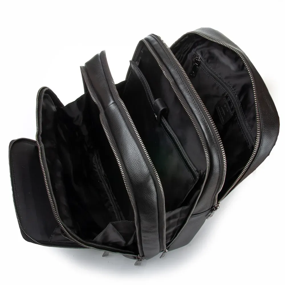 Большой мужской кожаный рюкзак Bretton. Изготовлен из натуральной мягкой кожи. Три отделения, закрываются на молнии. Внутри отделений находятся большой карман на молнии и карман для нетбука или планшета. На фасаде рюкзака расположены два вместительных кармана на молнии. Широкие и мягкие плечевые лямки регулируются по длине.