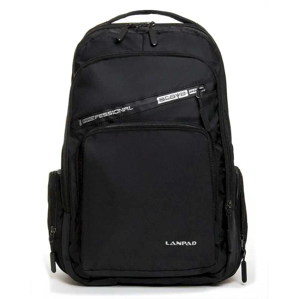 Рюкзак міський Lanpad. Виготовлений з матеріалу з водовідштовхувальним покриттям. Рельєфна спинка ущільнена. Два відділення, що закриваються на блискавку. Усередині є бічна відкрита подвійна кишеня та кишеня для ноутбука. На фасаді знаходиться дві кишені на блискавці і на бічних стінках є дві кишені на блискавці. Плечові лямки регулюються за довжиною.