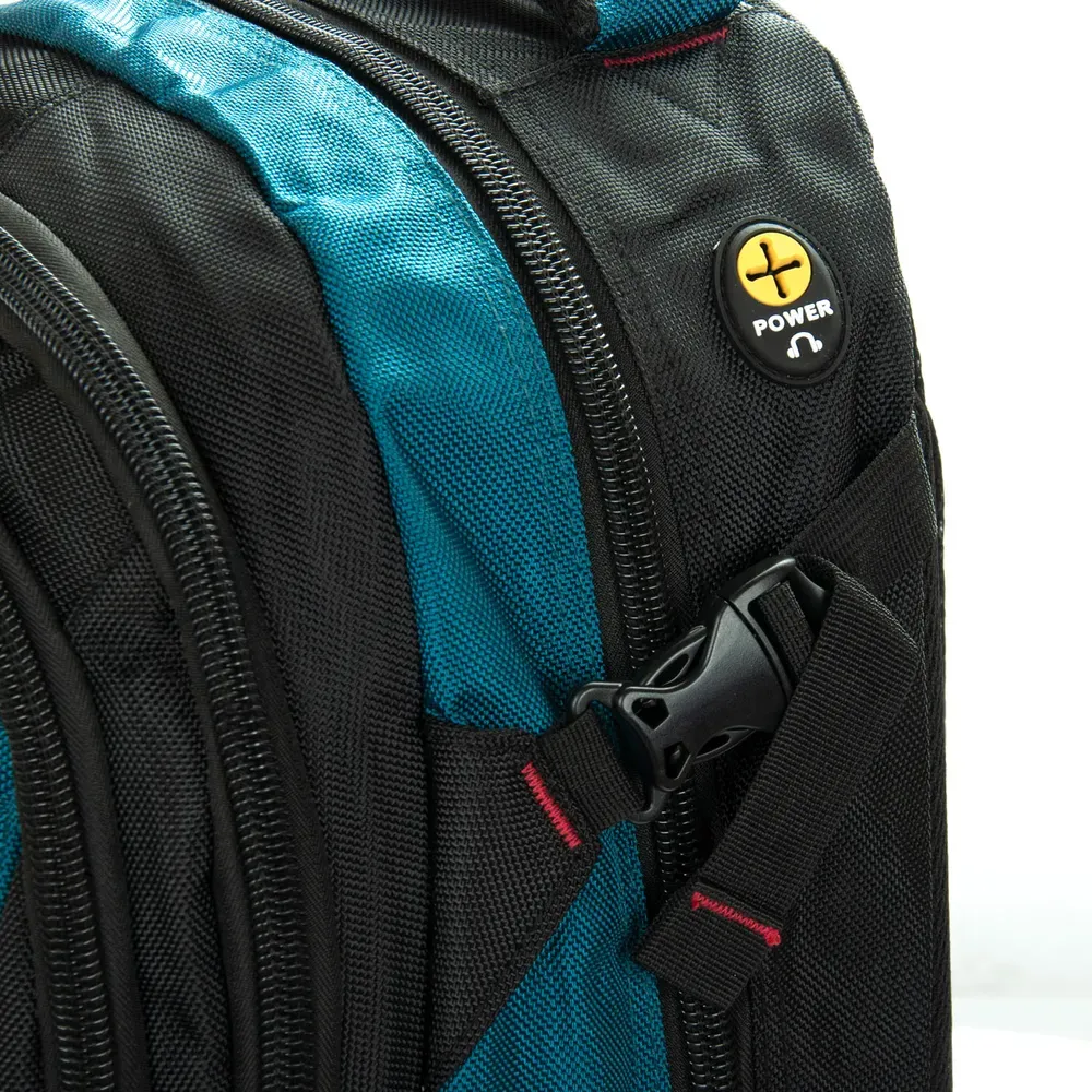 Плотная спинка с мягкими рельефными вставками для вентиляции. Внутри рюкзака находятся три отделения на молнии. В первом отделении расположен карман- органайзер, а в третьем отделении есть карман для ноутбука и карман для телефона. Также, из основного отделения есть выход для наушников на внешнюю стенку рюкзака. На фасаде находится карман на молнии. Снаружи на боковых сторонах рюкзака расположены карманы-сетки для бутылок воды объемом 0,5 литров.