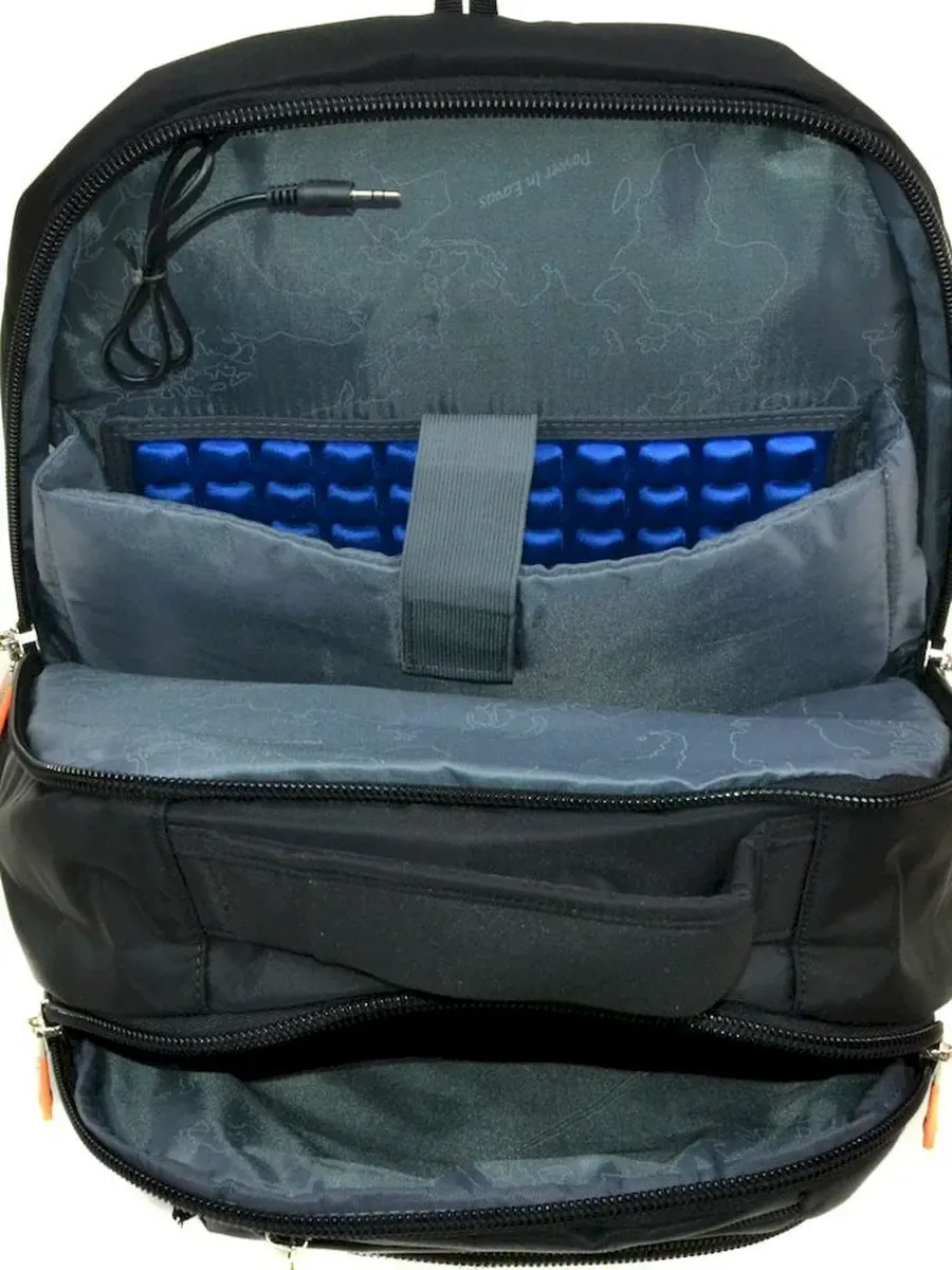Рюкзак "місто/спорт" ТМ "Power In Eavas". Щільна спинка. Два відділення на блискавках. Усередині першого є велика відкрита бічна кишеня. Друге відділення з кишенею для ноутбука та шнуром для навушників виведеним на ліву плечову лямку. На фасаді велика кишеня-органайзер на блискавці і дві маленькі кишені на блискавках. На торцях рюкзака відкриті кишені для пляшки води 0,5л. У комплекті знімна ключниця-косметичка. Плечові лямки регулюються по довжині та оснащені грудною стяжкою.