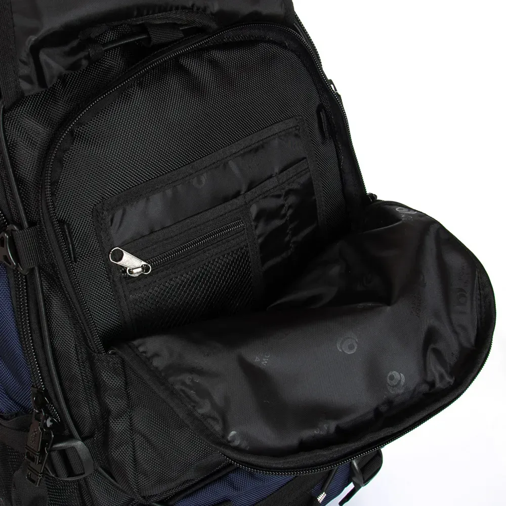 Два отделения, закрываются на молнию. Основное отделение с карманом для ноутбука. На фасаде рюкзака под клапаном есть один карман-органайзер на молнии и небольшой открытый карман. На клапане и внизу на фасаде есть два небольших кармана на молнии. На боковых сторонах рюкзака находятся карманы-сетки. Плечевые лямки регулируются по длине и оснащены грудной стяжкой и поясным ремнем.