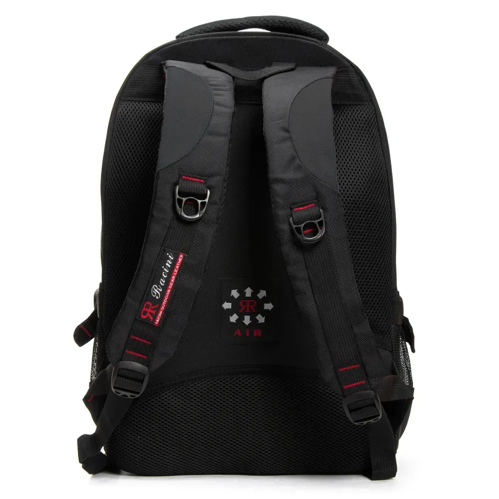 Городской рюкзак "Racini". Плотная спинка с мягкими вставками. Внутри рюкзака два отделения на молнии. В первом отделении расположен карман- органайзер, во-втором отделении есть карман для ноутбука и карман для смартфона. На фасаде находится вместительный карман на молнии. Снаружи на боковых сторонах рюкзака расположены карманы-сетки для бутылок воды объемом 0,5 литров.