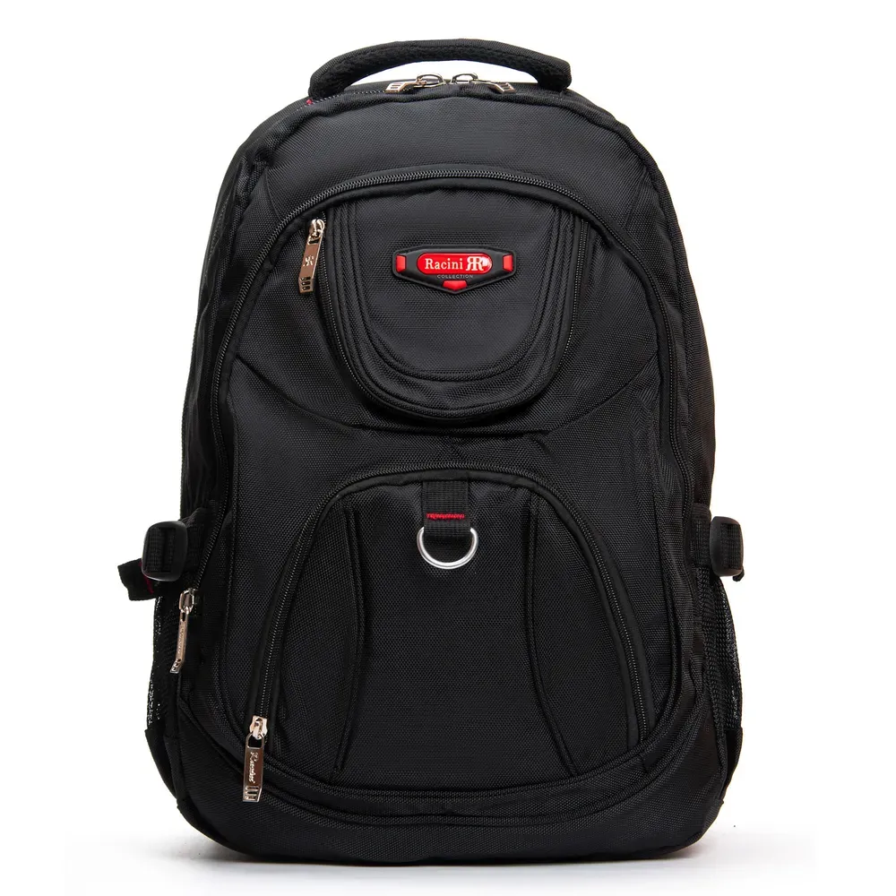 Городской рюкзак "Racini". Плотная спинка с мягкими вставками. Внутри рюкзака два отделения на молнии. В первом отделении расположен карман- органайзер, во-втором отделении есть карман для ноутбука и карман для смартфона. На фасаде находятся два кармана на молнии. Снаружи на боковых сторонах рюкзака расположены карманы-сетки для бутылок воды объемом 0,5 литров.