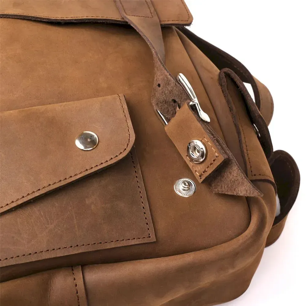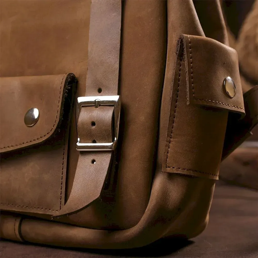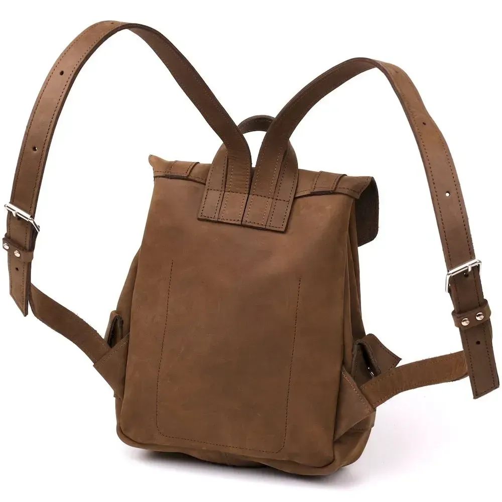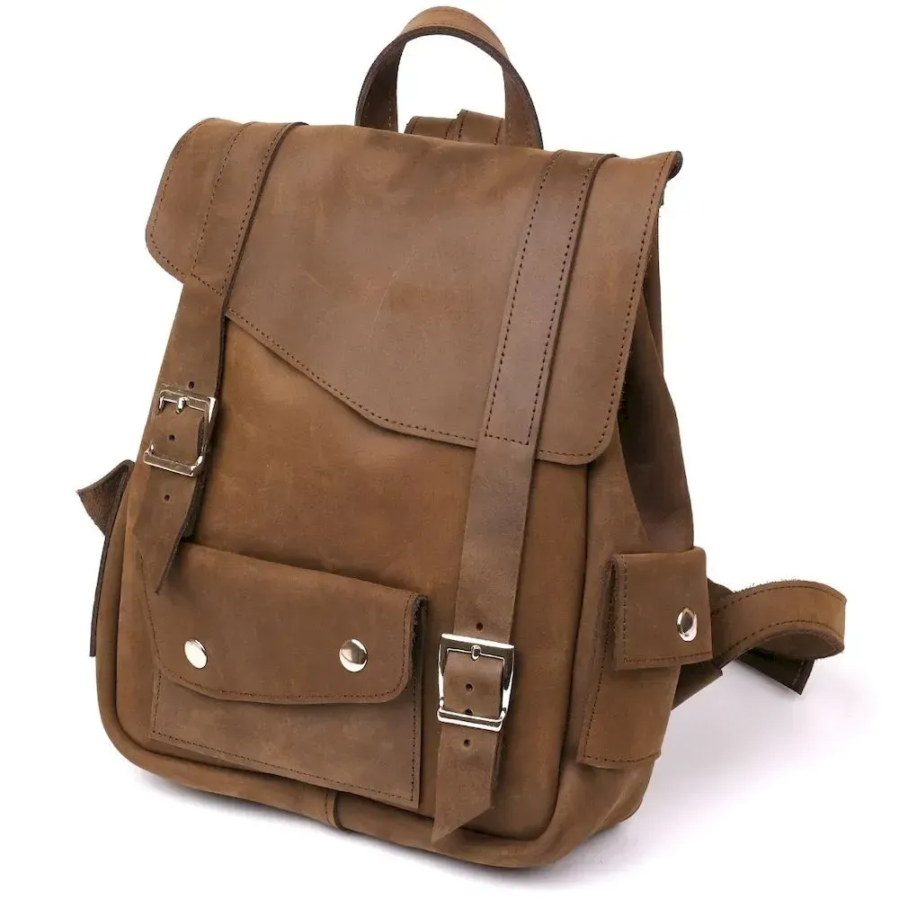 Зручний вінтажний рюкзак для міста. Варто звернути увагу, що у рюкзаку відсутня підкладка. Усередині рюкзака тильна сторона шкіри. Аксесуар доповнений сріблястою фурнітурою у дизайн. Рюкзак приємний на дотик. Надійно прошитий міцною ниткою в темних тонах, яка надає аксесуару родзинку. Шкіра, з якої виконаний рюкзак має особливу популярність серед багатьох клієнтів. Її обирають за зовнішній вигляд, який змінюється на краще в процесі експлуатації, покриваючись розкішними потертостями.