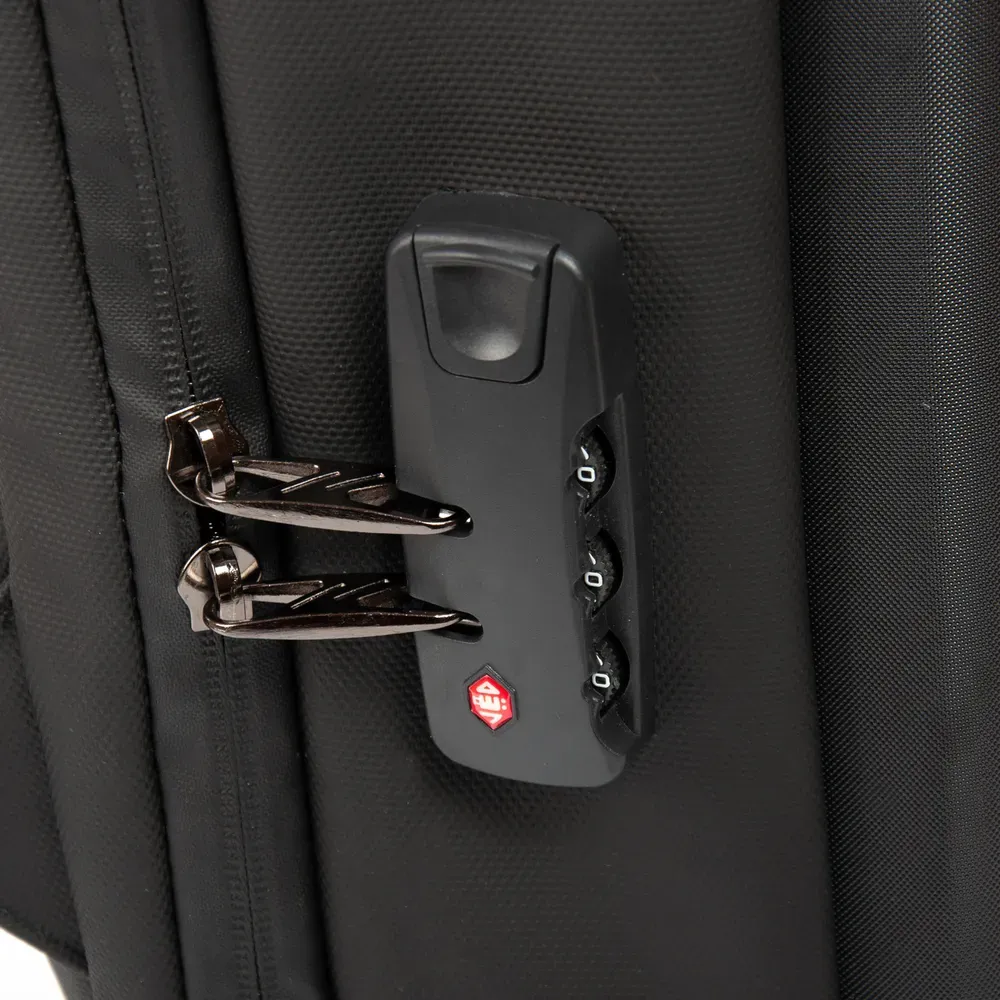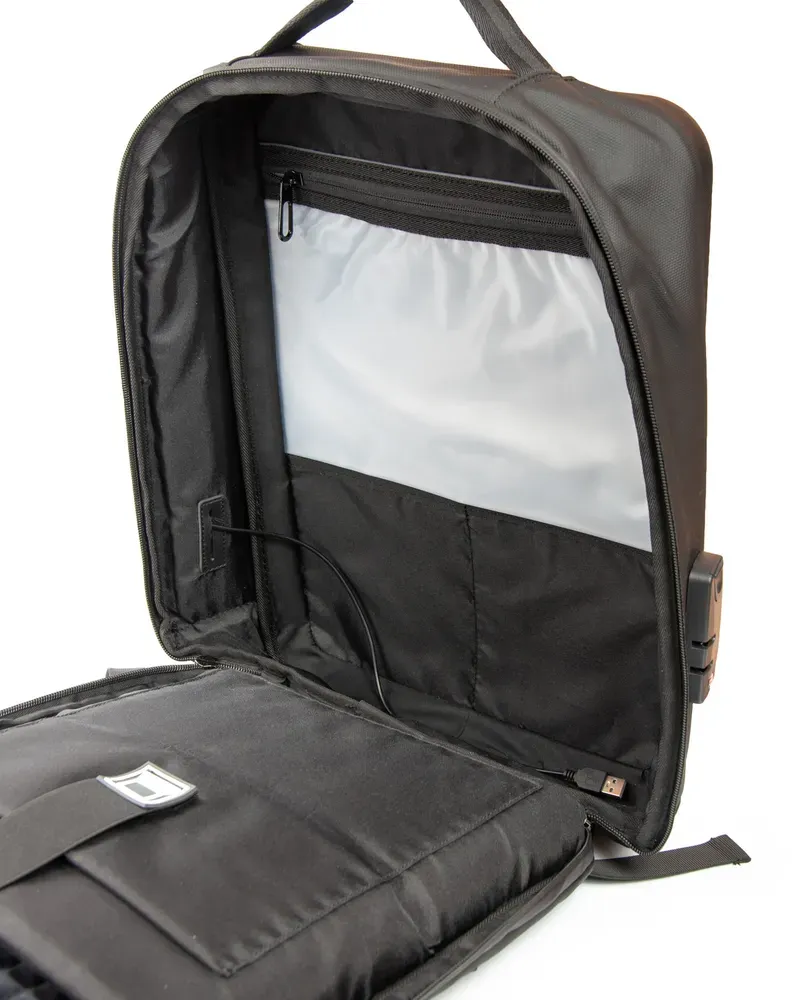 Одно основное отделение закрывается на молнию с кодовым замком. Внутри находится специальный карман для ноутбука и большой карман для бумаг формата А4. Также есть полностью герметичный карман на молнии. Из отделения на внешнюю боковую сторону выведен USB кабель с защитным чехлом снаружи.
