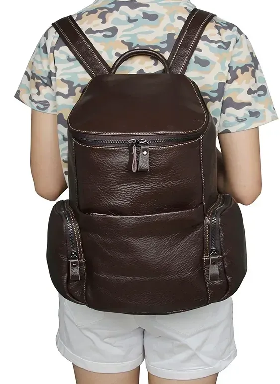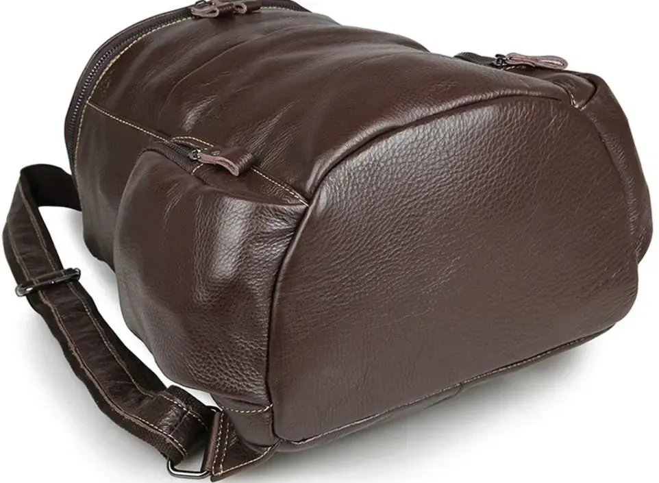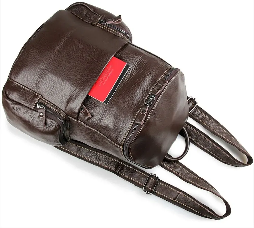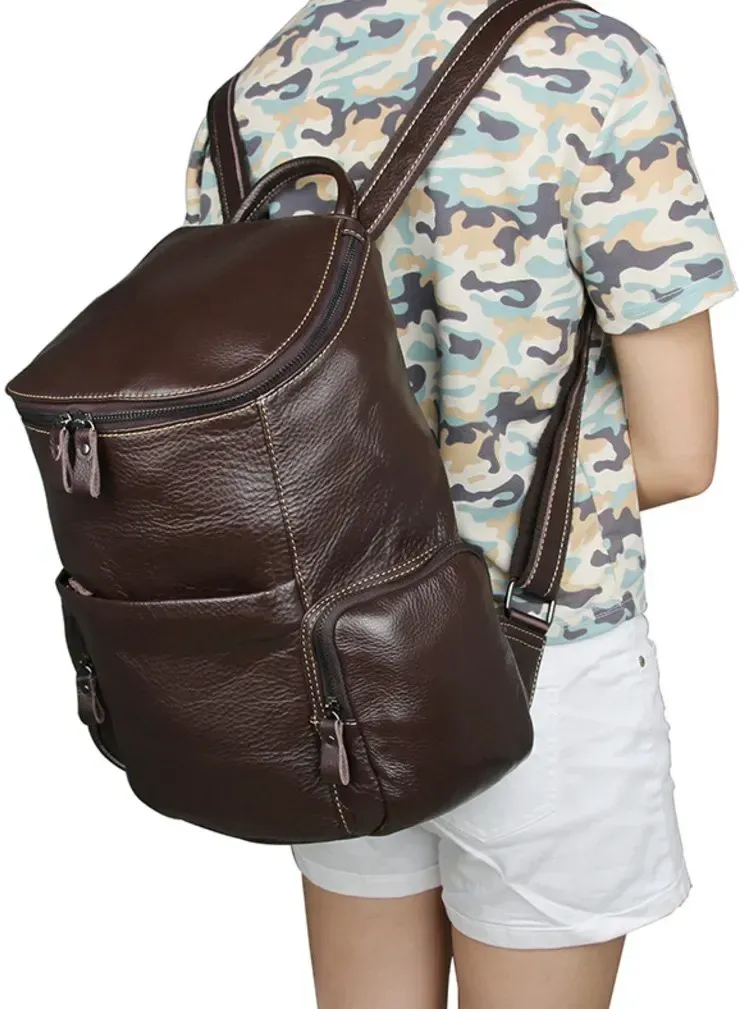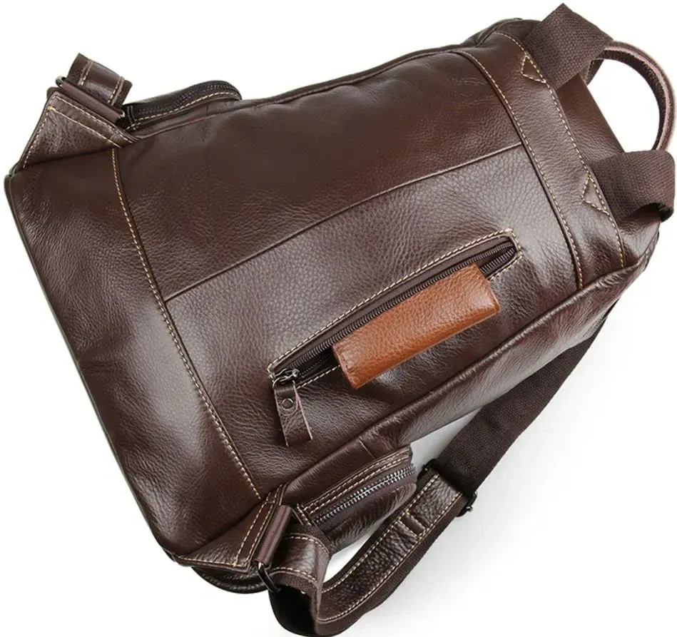 Оригінальний рюкзак з натуральної шкіри темно-коричневого кольору. Особливістю даної моделі є те, що її можна носити в руці, на плечі, а також за спиною. Крім того, цей рюкзак має безліч кишень і відділень роблять його незамінним для міської людини. Колір фурнітури: латунь. Рюкзак упакований у текстильний чохол білого кольору.