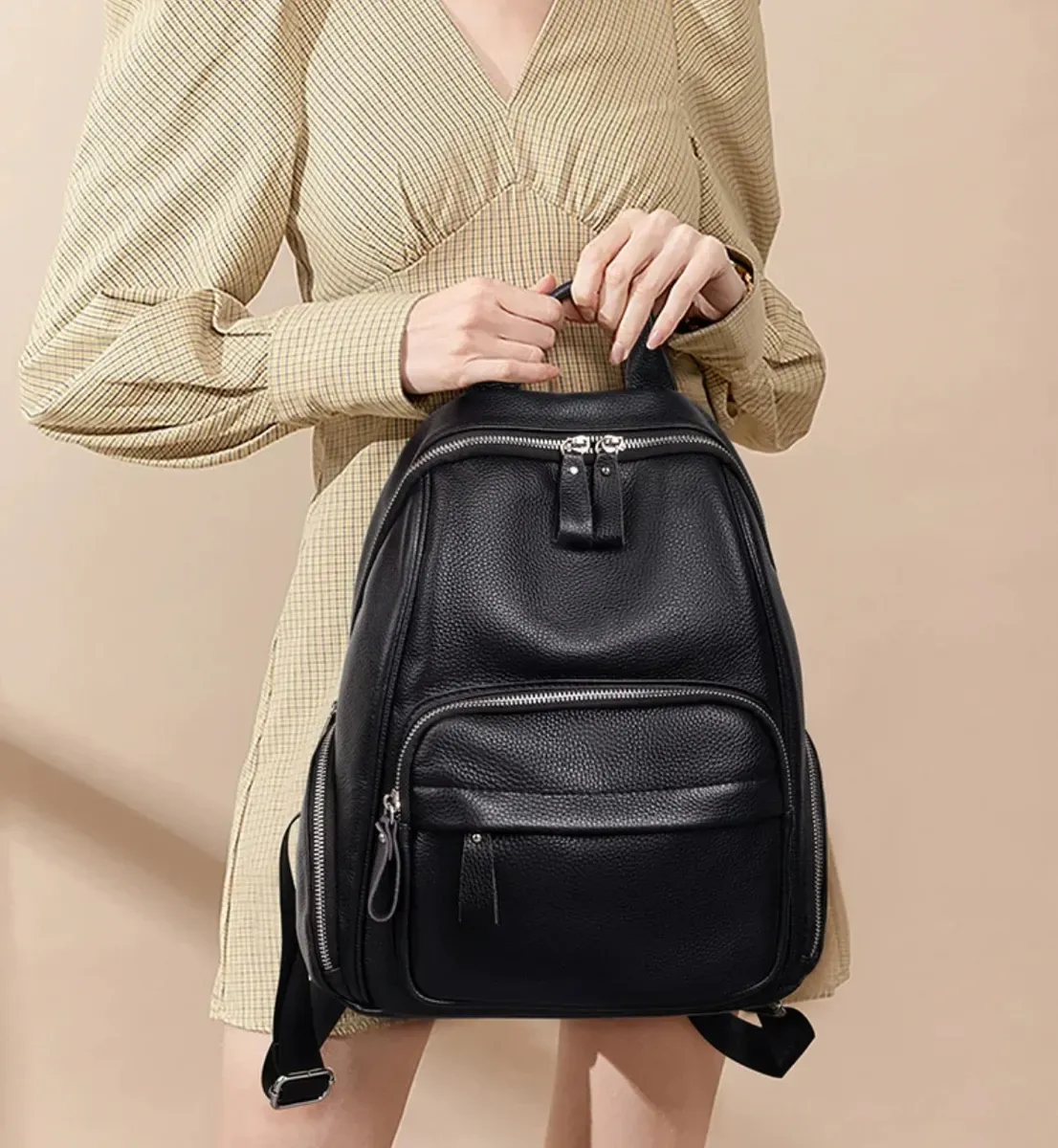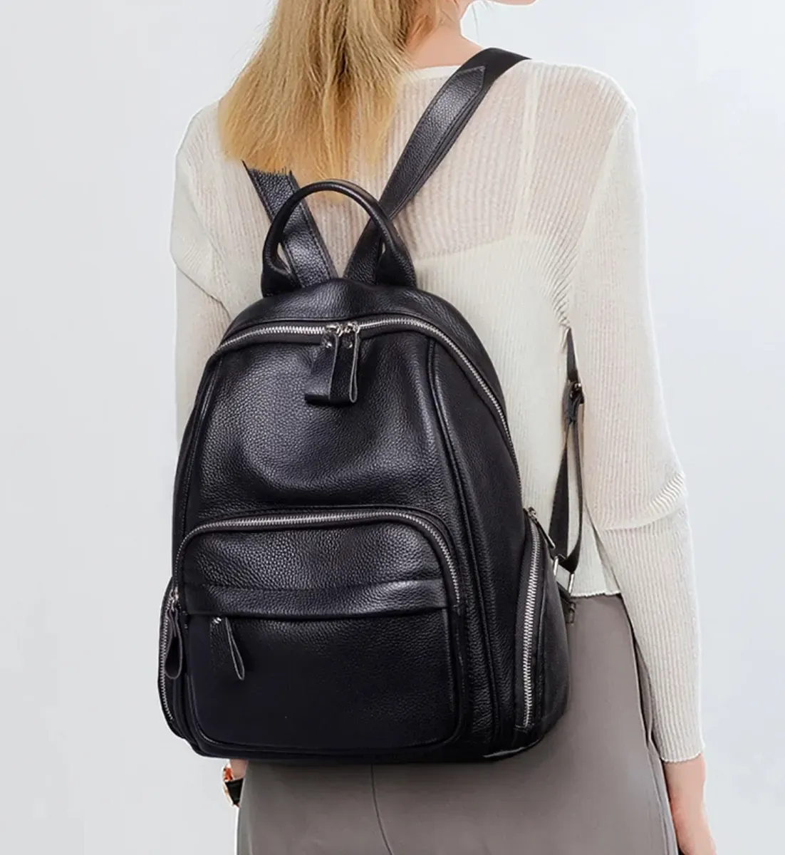 Стильний аксесуар для дівчат і жінок, необхідний для повсякденного життя, яка стає динамічнішою, активнішою та швидкіснішою. У такий практичний і функціональний рюкзак дасть змогу розмістити багато різноманітних речей. Виготовлений із натуральної шкіри, у практичному чорному кольорі, який буде доречний у будь-якій колірній гамі гардероба. Вміщує документи формату А5.