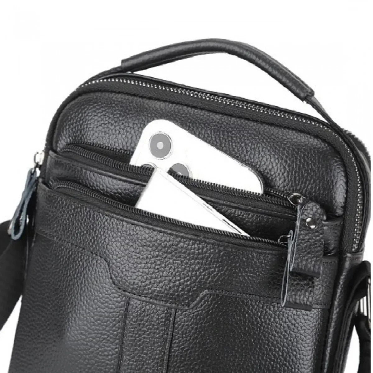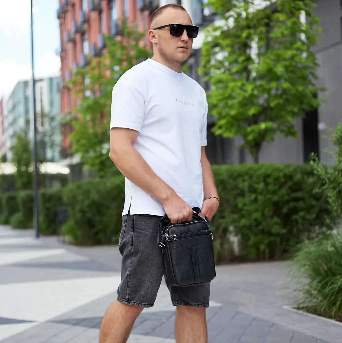 Чорна чоловіча шкіряна сумка через плече з натуральної шкіри. Текстильний плечовий ремінь регулюється по довжині, фурнітура срібного кольору. Сумка має два основні автономні відділення на блискавках. З лицьового боку сумки розміщено дві кишені, з тильної - одна кишеня на блискавках. З таким месенджером можна ходити як на роботу, так і на прогулянку. У ньому достатньо місця, щоб помістити необхідний мінімум потрібних речей, гаджетів та дрібниць, які можуть знадобитися будь-якої хвилини.
