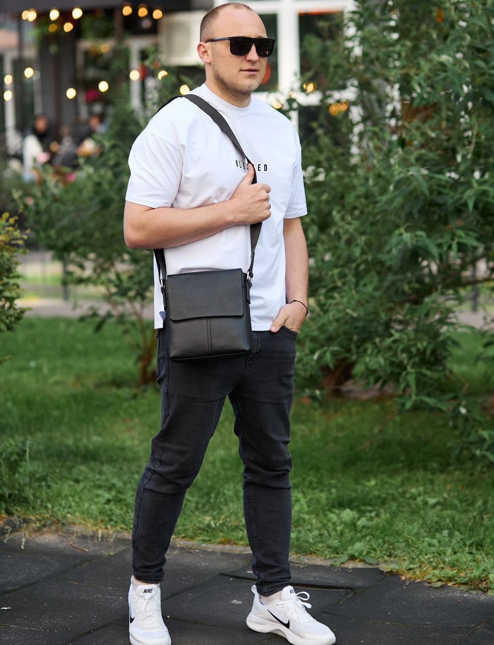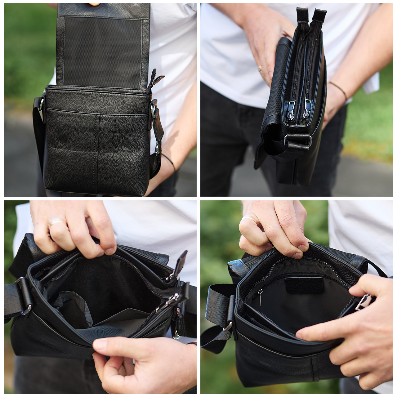 Чоловіча шкіряна сумка через плече (месенджер) є дуже потрібним і практичним аксесуаром для сучасного чоловіка. Ця сумка має стильний вигляд, якісно зроблена та гармонійно підійде до будь-якого стилю, а завдяки своїй формі зручна у використанні. Сумка закривається на перекидний клапан, під яким розміщено два основні відділення, що закриваються на змійці. Усередині сумки додатково є бічна кишеня на блискавці та дві відкриті кишені для дрібниць. Зовні під клапаном розміщена глибока відкрита кишеня, а з тильного боку — врізна кишеня на блискавці. Підкладка сумки — текстиль. Колір фурнітури — срібло. Має текстильний регульований ремінь.