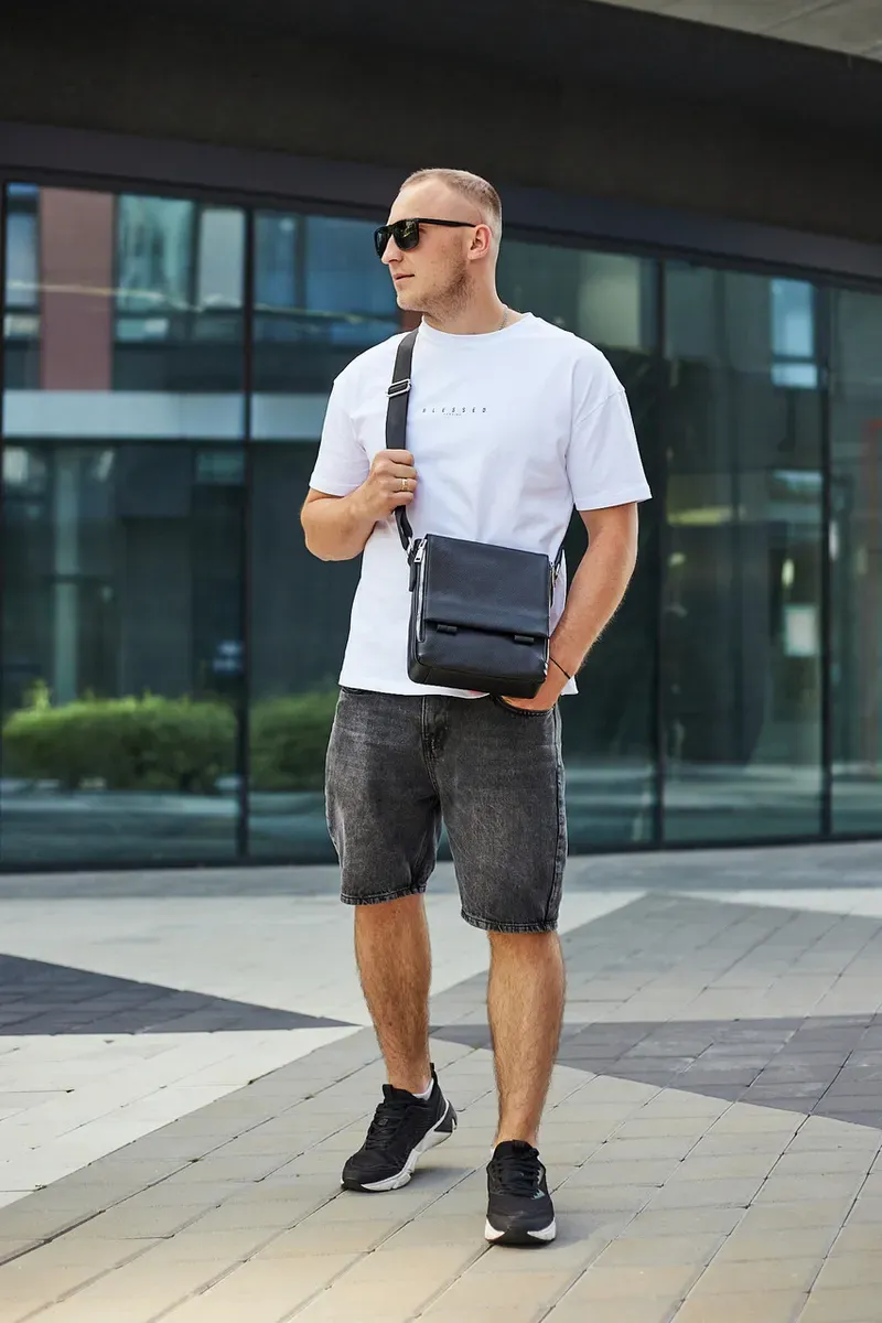 Чорна шкіряна сумка в чорному кольорі з зернистою текстурою. Сумка оснащена текстильним плечовим ременем, який регулюється по довжині, сріблястою фурнітурою і шкіряними пуллер. Сумка має одне основне відділення, яке знаходиться під клапаном. Клапан закривається на дві магнітні кнопки. Також з лицьового боку є кишеня відкритого типу, з тильного боку є кишеня відкритого типу на магнітній кнопці. Основне відділення розділено на дві частини, кишенею-перегородкою на блискавці, також всередині є кишеня відкритого типу і кишеню на блискавки.