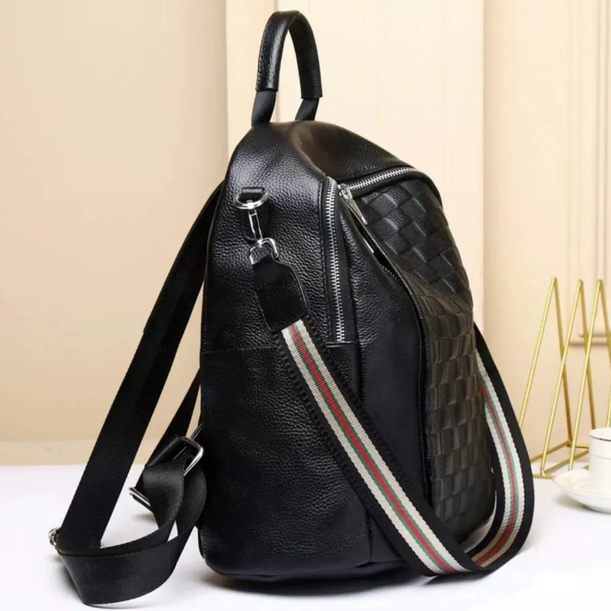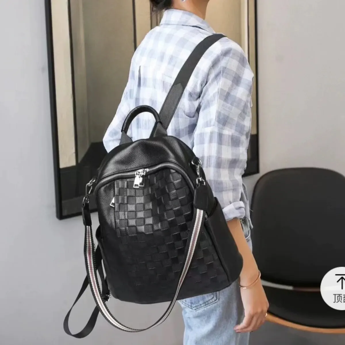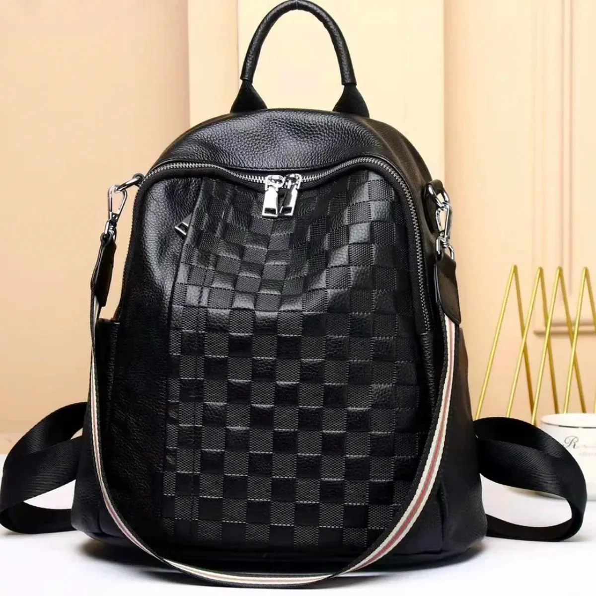 Шкіряний жіночий рюкзак з тисненням 25х30х11, сумка наплічна з шахматним візерунком, чорна