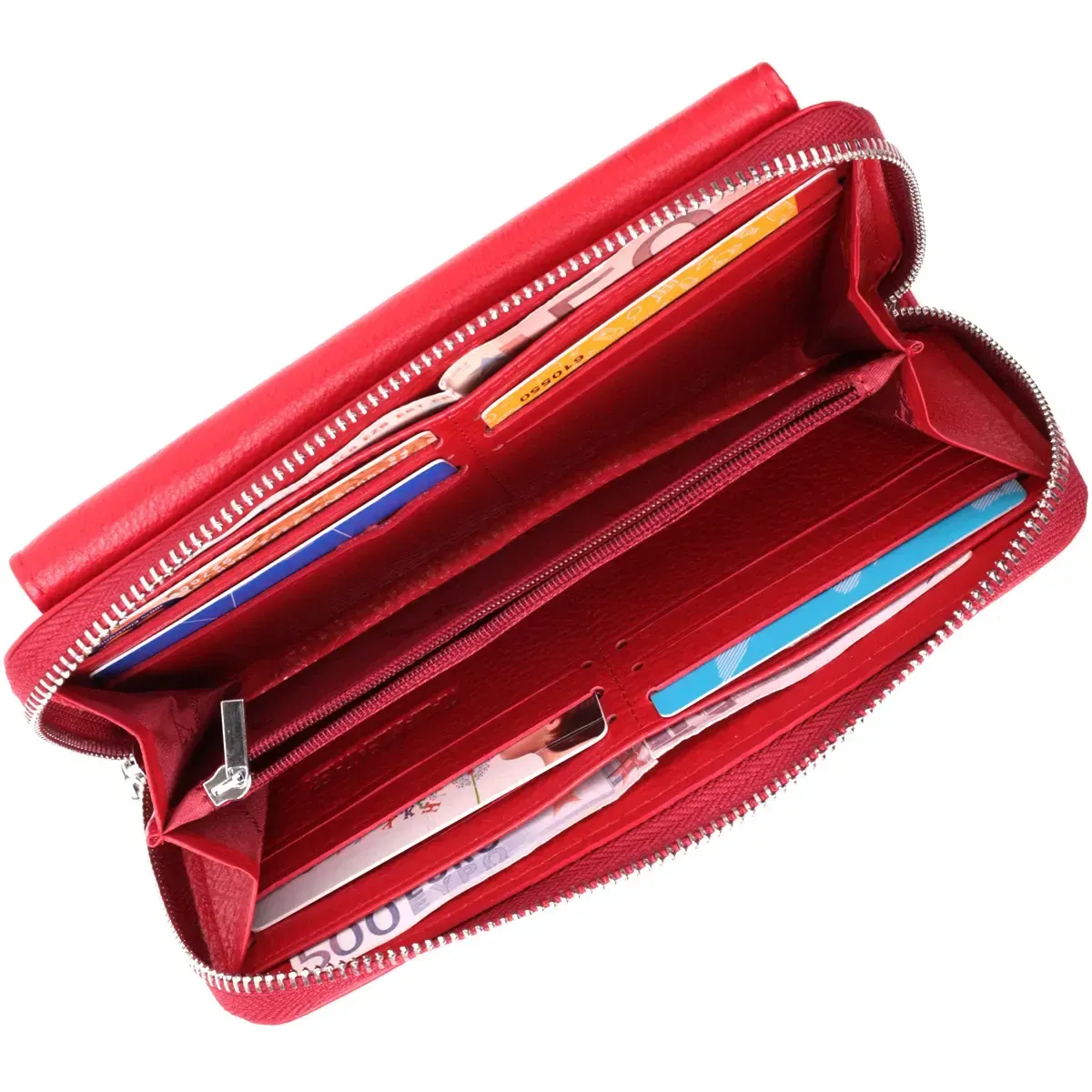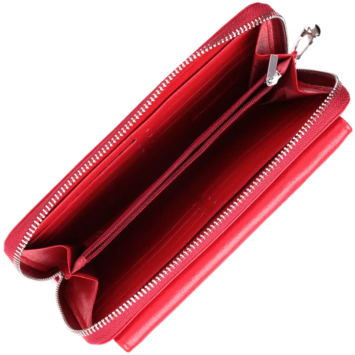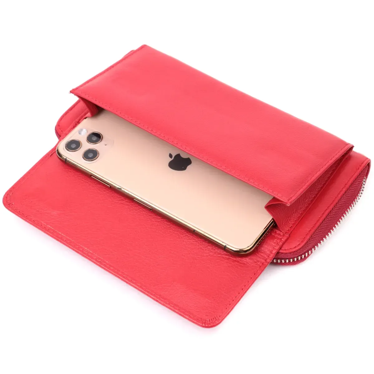 Яскравий місткий гаманець-клатч для жінок із натуральної шкіри, в гарному червоному кольорі, з використанням добротного текстилю (внутрішня підкладка). Використовується якісна фурнітура кольору срібла. Клатч одночасно, компактний і функціональний, в нього можна помістити свій телефон, щоб не заважав в руках. Запакований у фірмову коробку білого кольору.