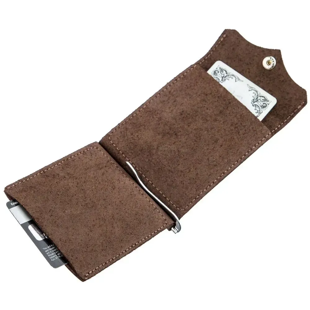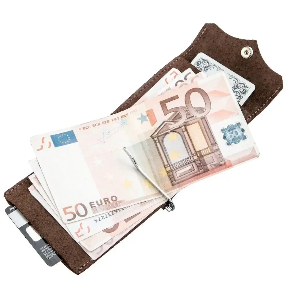 Компактний затиск із італійської натуральної шкіри найвищої якості коричневого кольору. На лицьовій стороні аксесуара тиснений логотип бренда-виробника. Затискач стане для вас ідеальним рішенням, якщо ви не шанувальник портмоне або клатча. За рахунок свого невеликого розміру затискач легко поміститься в кишеню або невелику сумку. Ви також можете покласти в нього пару необхідних кредиток. Сама конструкція затиску виготовлена з надійного металу. Виріб стане чудовим подарунком для близької людини. Модель упакована у повстяний чохол.