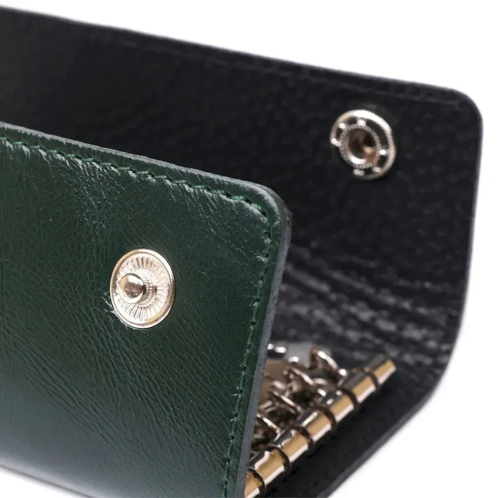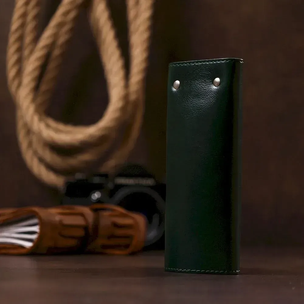 Дуже стильна і красива ключниця в модному темно-зеленому кольорі, що став трендовим у цьому сезоні. Виконана вона із натуральної пружної шкіри високої міцності та стійкості до зносу. Виріб чудово тримає форму і чудово захищає ключі, які чіпляються на шість карабінів усередині аксесуара. Фурнітура має срібний колір.