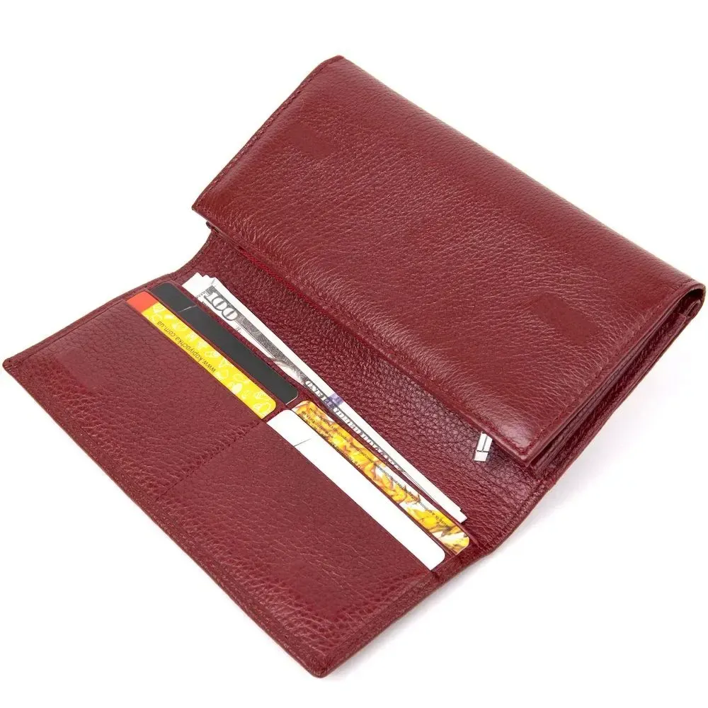 Шикарний жіночий гаманець у красивому темно-червоному кольорі. Виконаний із добротної високоякісної шкіри у зернистій фактурі. Дизайн виробу продумань до дрібниць, тому гаманець обов'язково стане улюбленою річчю своєї пані. Відмінною рисою моделі є наявність додаткового відділення для карток, яке закривається на регульовану кнопку. Запакований у фірмову коробку.