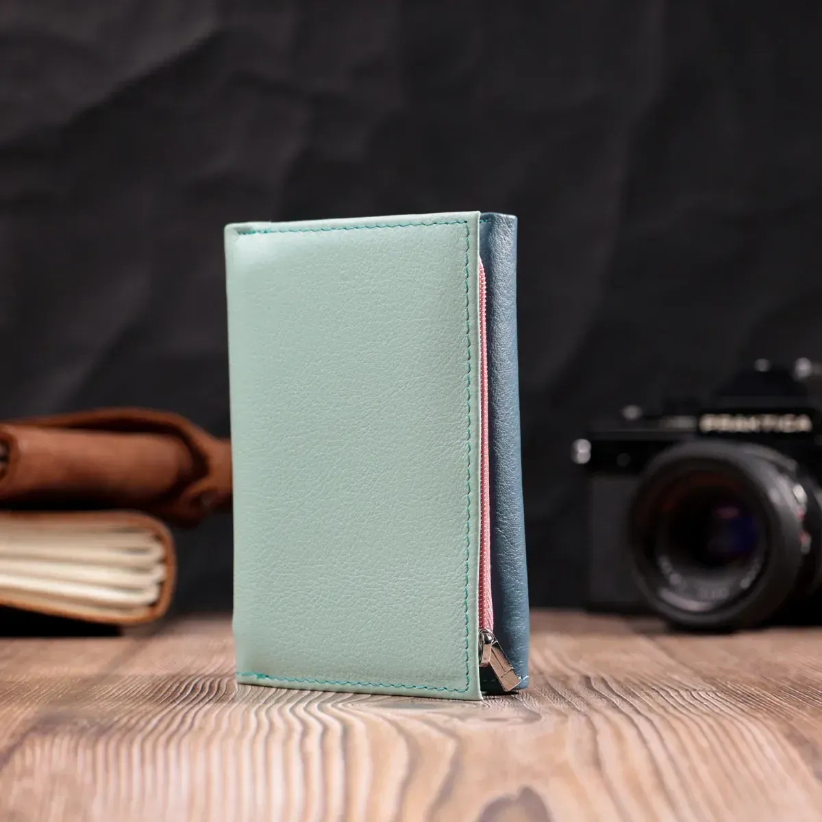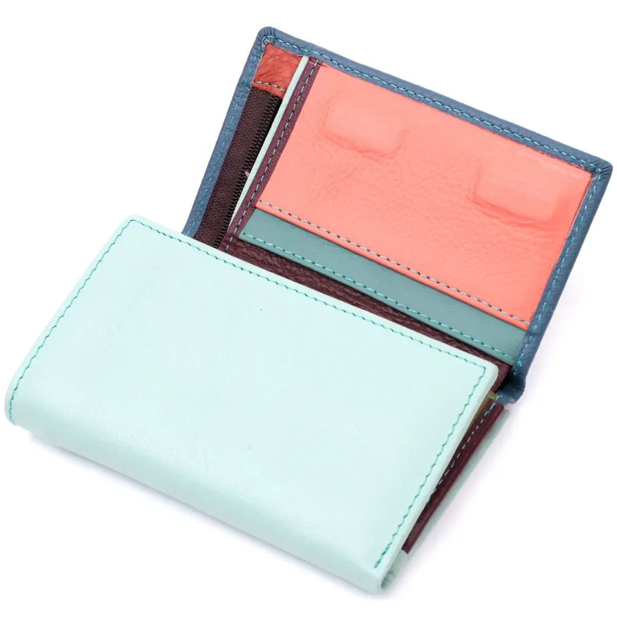 Компактне жіноче портмоне в три складення з натуральної шкіри найвищої якості. Перше, що впадає в око це колірне рішення, замість однотонного аксесуара ми маємо різнокольоровий, який містить два основні зовнішні кольори і кілька додаткових всередині. Шкіряне портмоне дуже практичне і служить досить довго. Аксесуар складається з двох містких кишень для купюр, кишені на блискавці через всю довжину, п'яти осередків для карт, прозорого віконця для пропуску та зовнішньої кишені на блискавці з перегородкою, що чудово прослужить для монет. Портмоне доповнено надійною фурнітурою. Укомплектований гаманець у фірмову картонну коробку білого кольору.