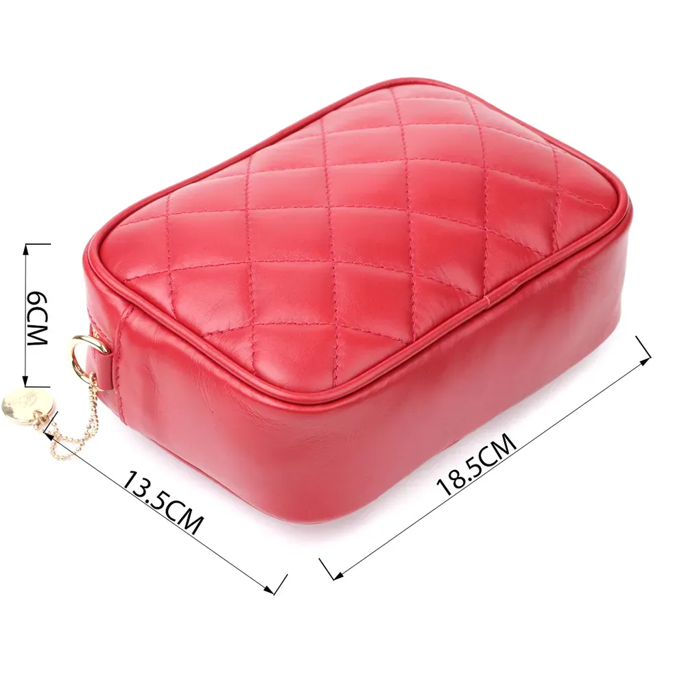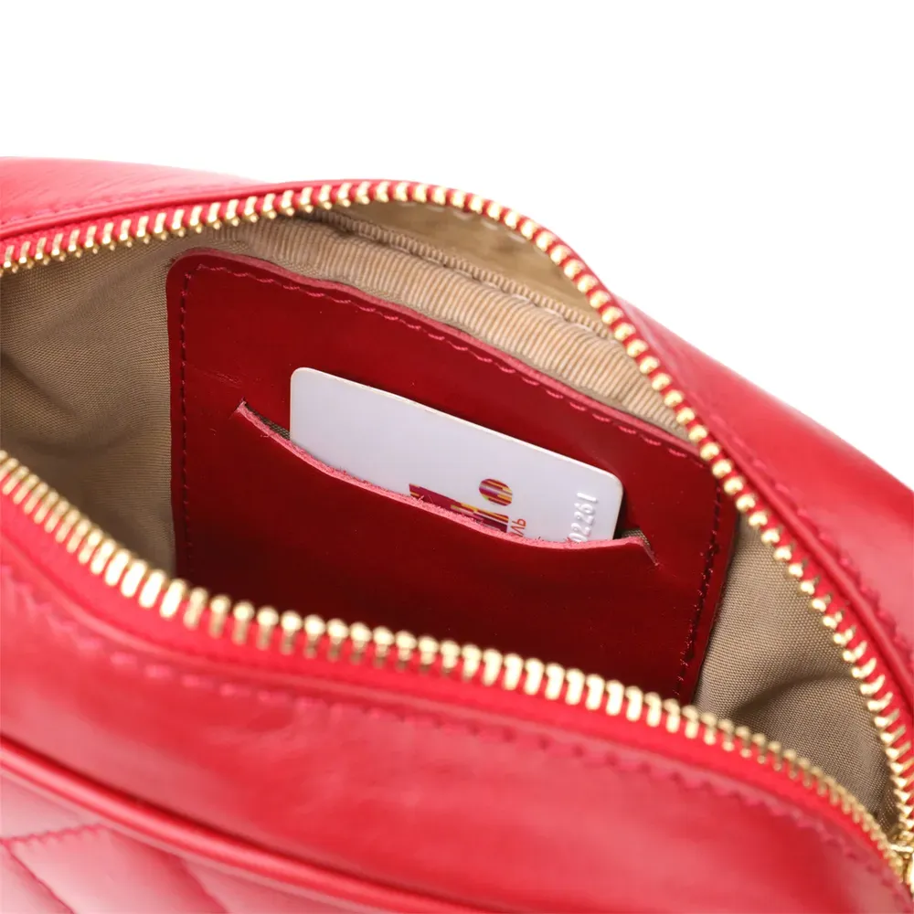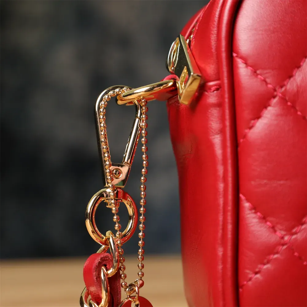Компактна сумка з натуральної шкіри у насиченому червоному кольорі. Стигана ромбами поверхня підкреслює витончений дизайн і додає аксесуару елегантності. Одне основне відділення дозволяє зручно розмістити все необхідне, зберігаючи компактність та легкість. Ручка-ланцюжок довжиною 135 см робить сумку універсальною: її можна носити як на плечі, так і через плече. Така деталь надає аксесуару сучасного характеру і завершує образ стильної жінки.