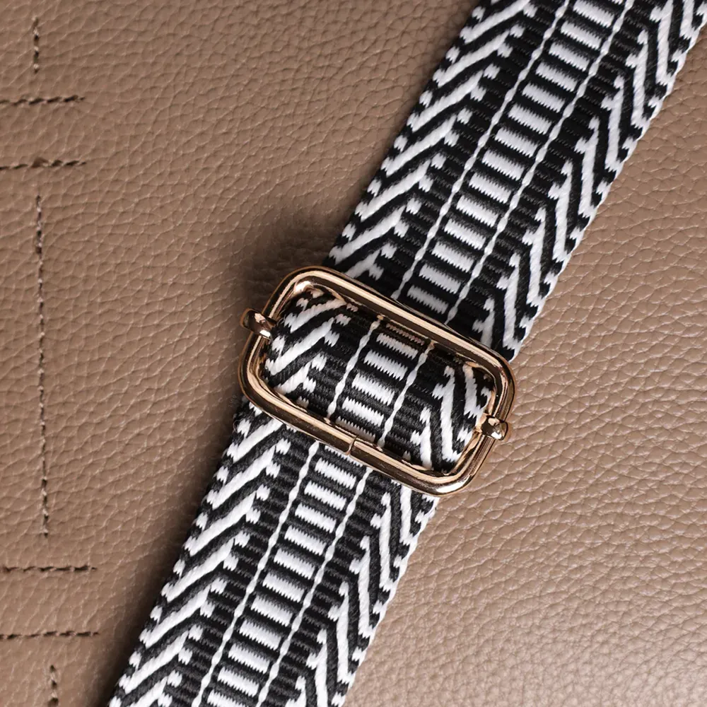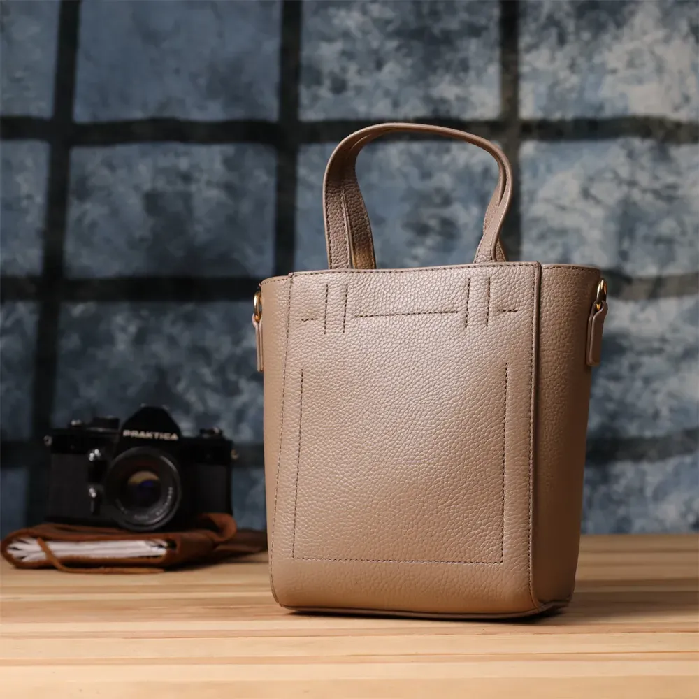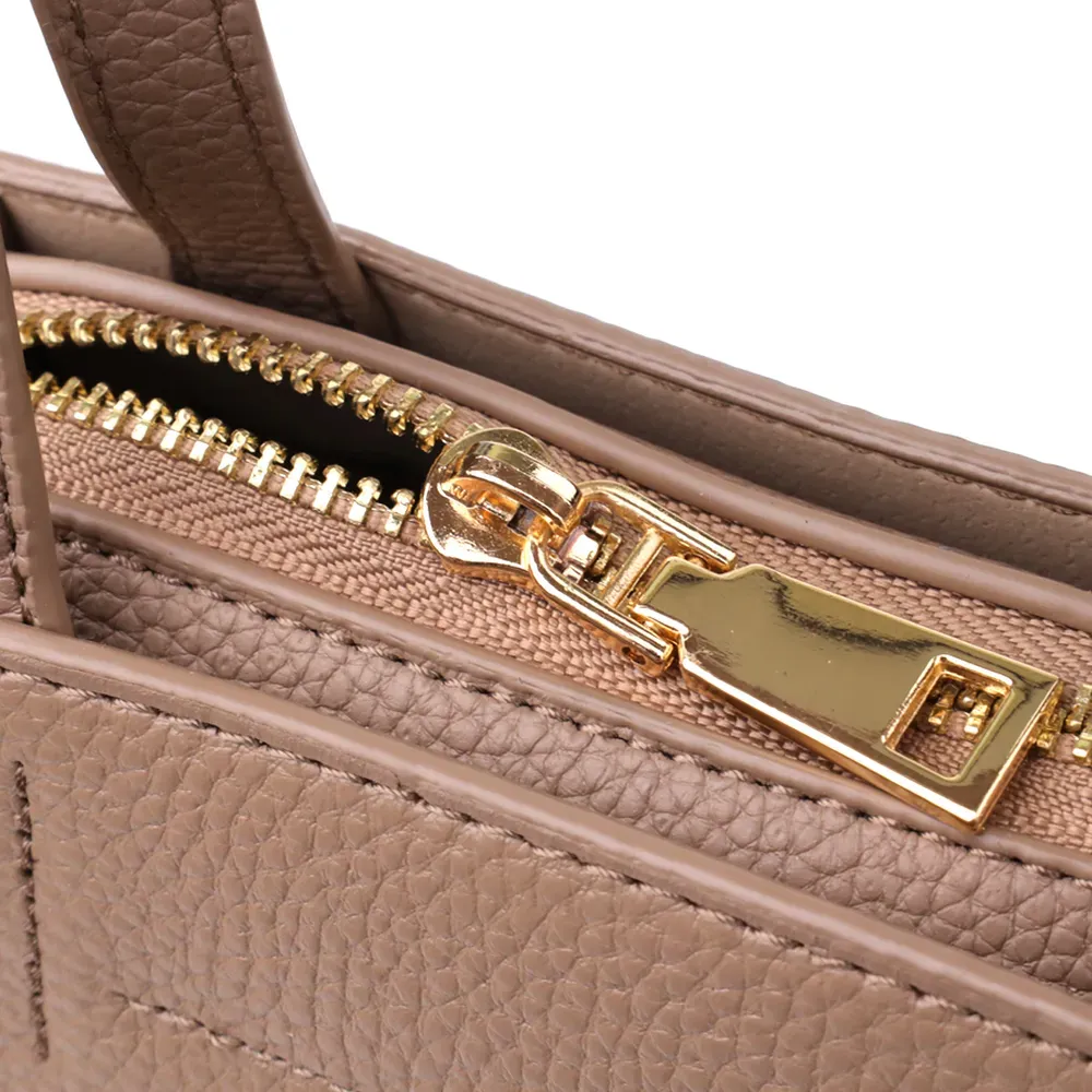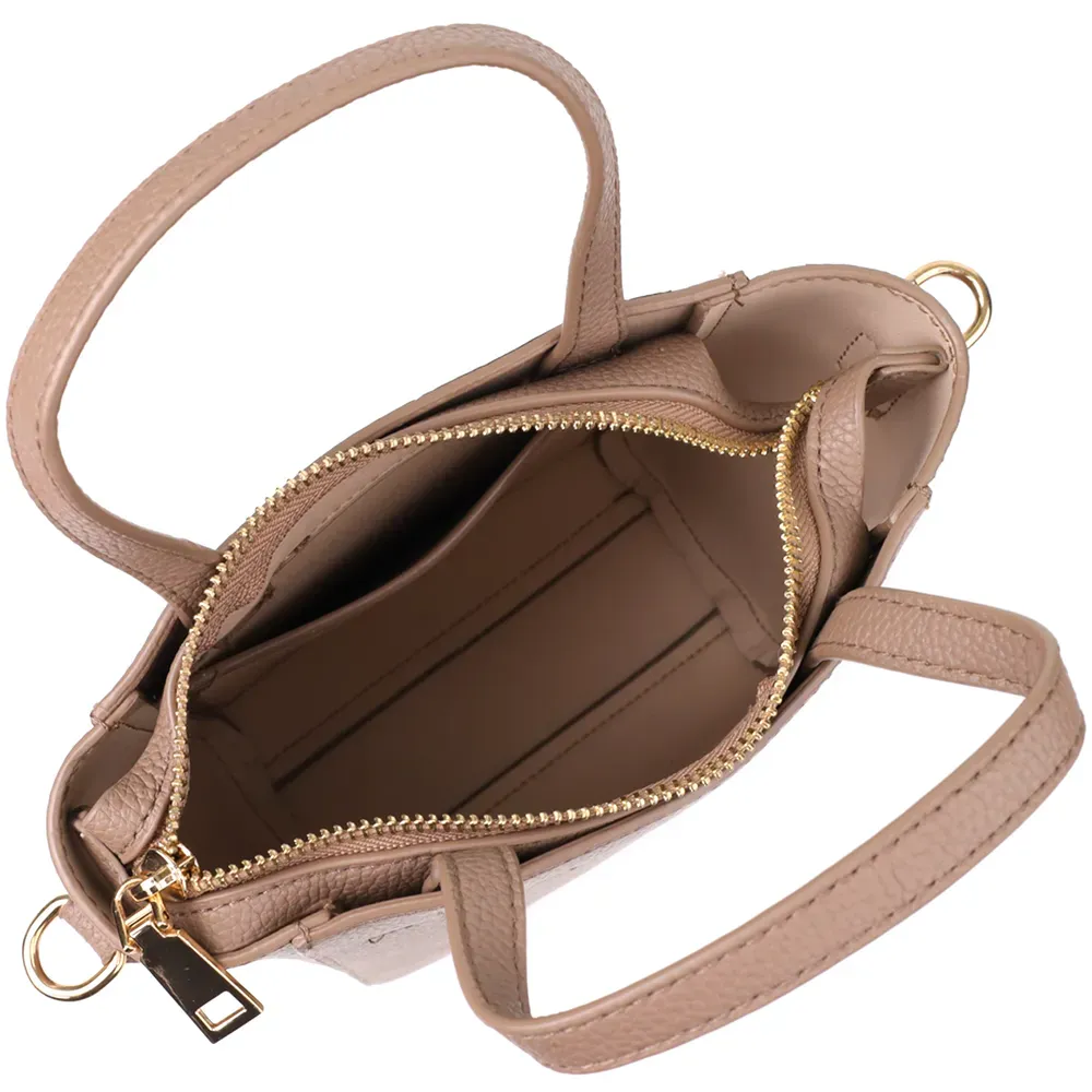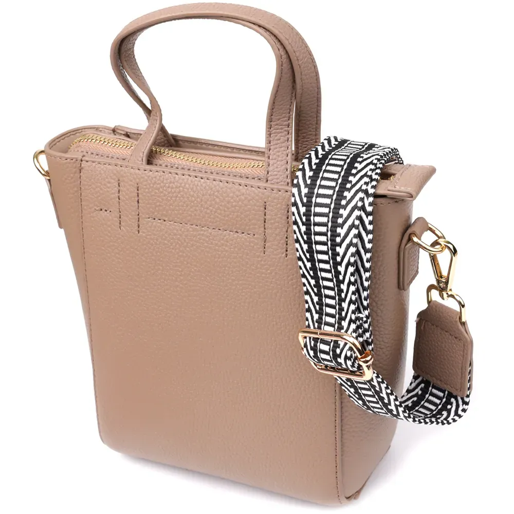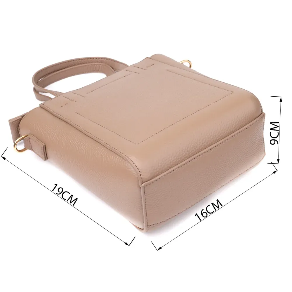 Фурнітура у вишуканому золотому кольорі гармонійно поєднується з теплим відтінком шкіри, додаючи образу витонченості. Знімний текстильний ремінець дозволяє носити сумку через плече або на плечі, забезпечуючи максимальний комфорт у повсякденному носінні.