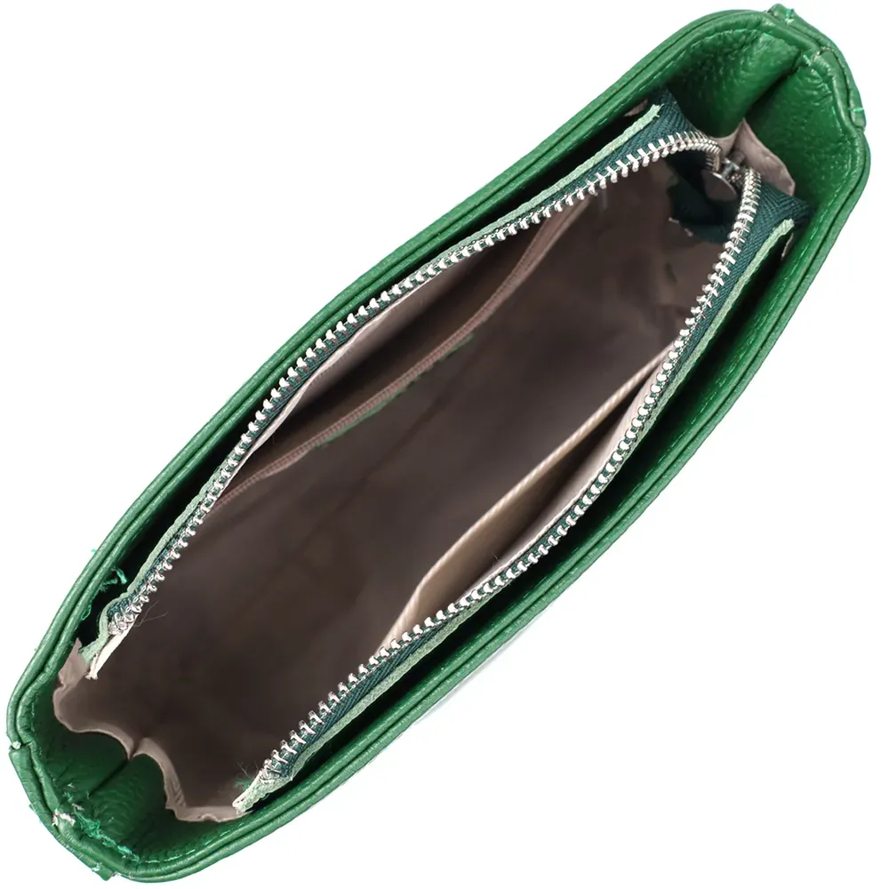 Оригінальна та стильна сумка з натуральної шкіри у насиченому зеленому кольорі – ефектний акцент у вашому повсякденному чи діловому образі. Модель оснащена одним основним відділенням, яке надійно закривається на блискавку. Усередині розташовані дві зручні кишені: потайна на блискавці для зберігання цінних дрібниць і відкрита кишеня — для предметів, до яких потрібен швидкий доступ.