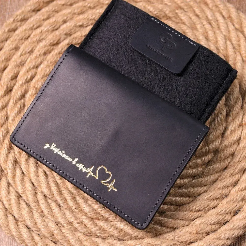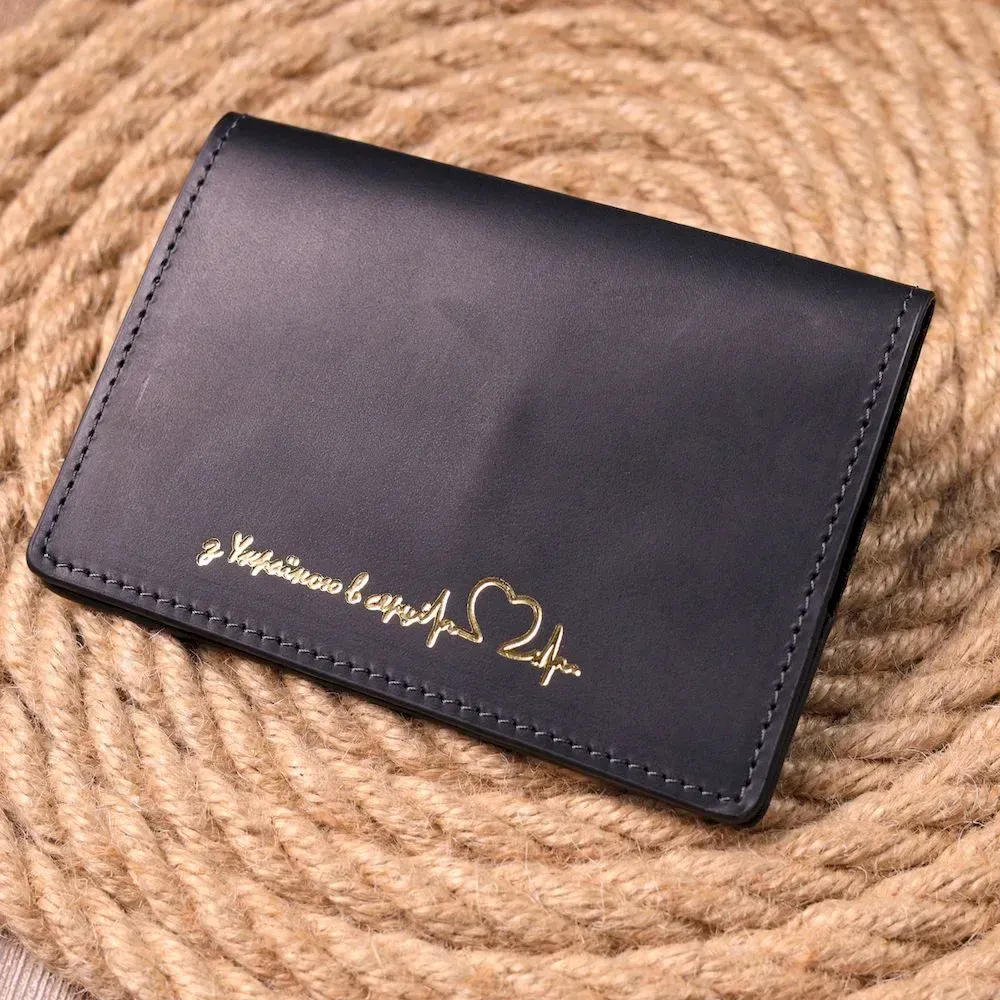 Добротна обкладинка на паспорт із якісної італійської шкіри, з патріотичним написом “З Україною в серці”. Особливістю шкіряної обкладинки є те, що вона надійно захищає документ від пошкоджень та має довгий термін служби. Виріб без застібки, упакований у фірмовий чохол із фетру. Шкіряна обкладинка на паспорт підійде як чоловікам, так і жінкам, а ще буде чудовим подарунком на будь-яке свято.