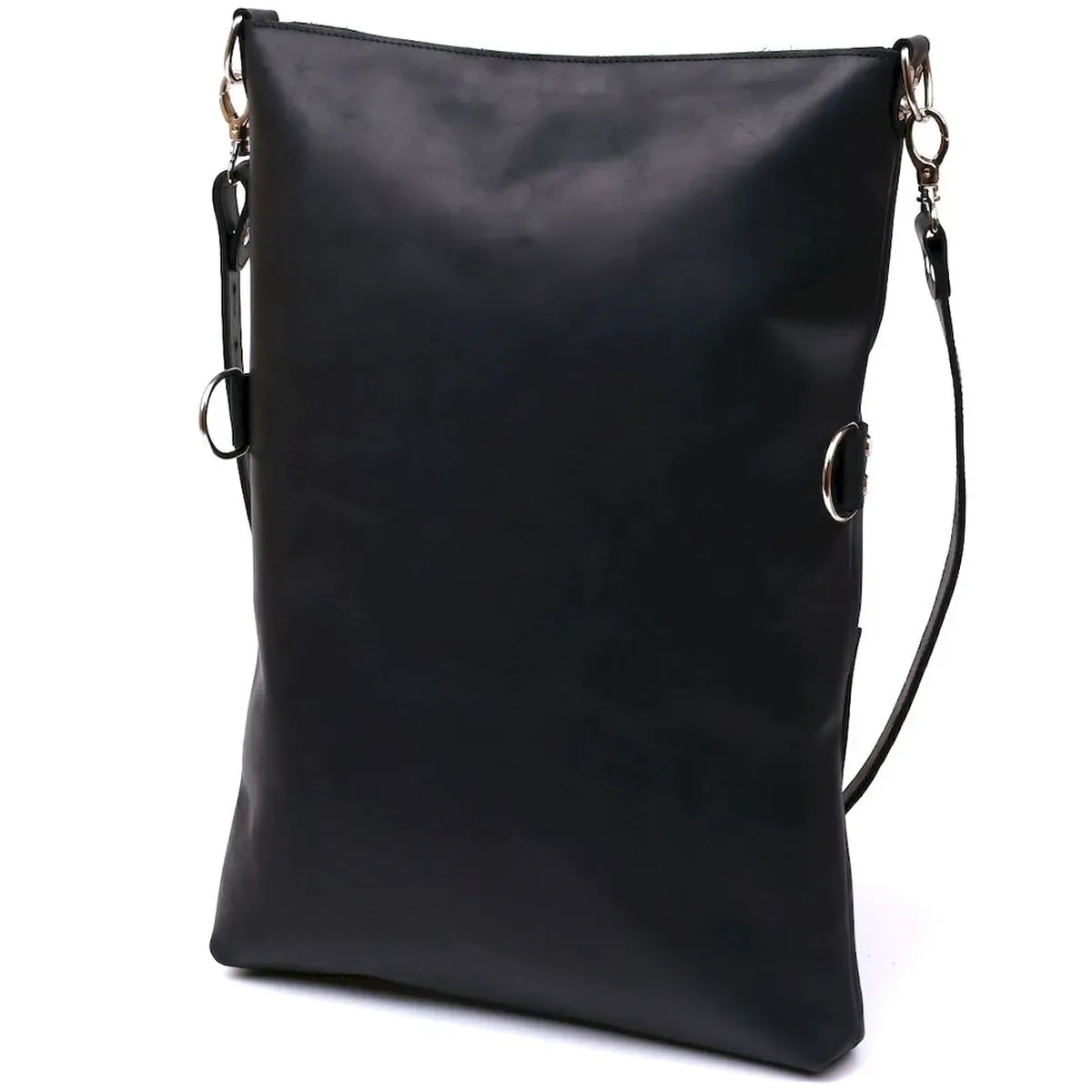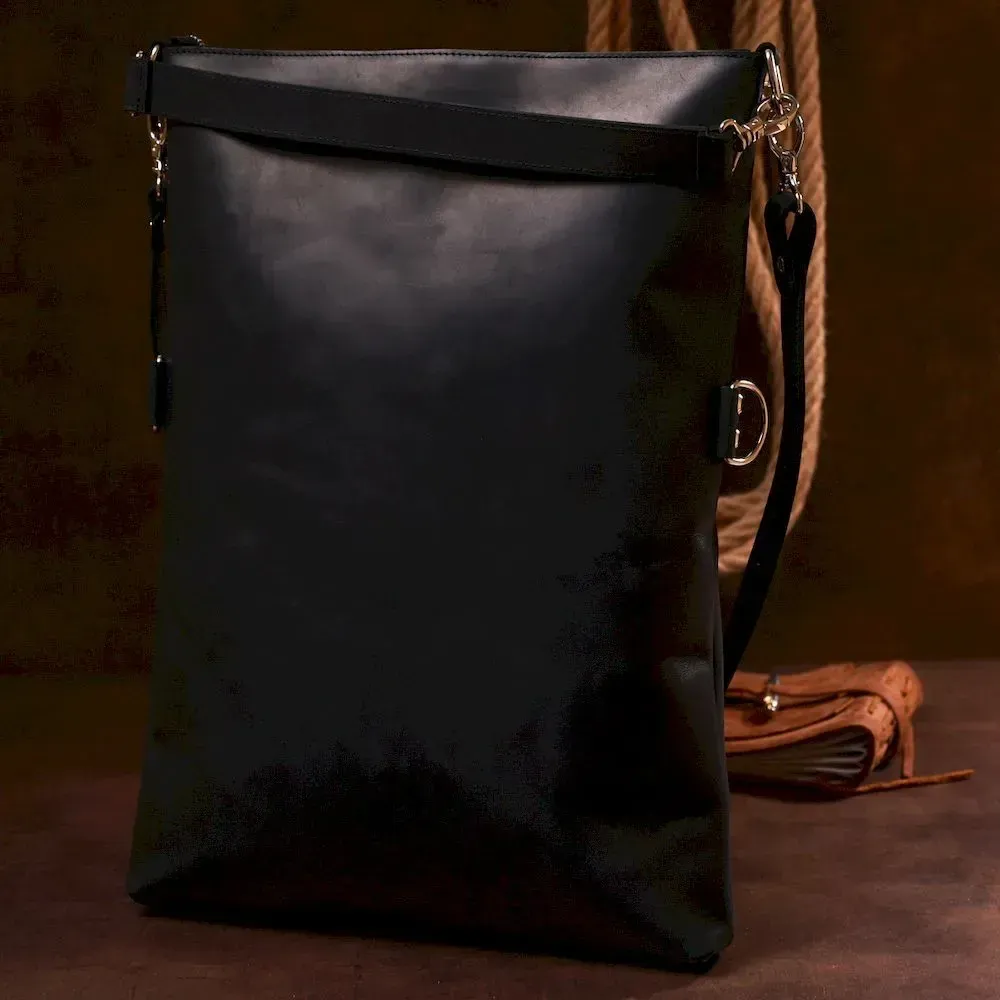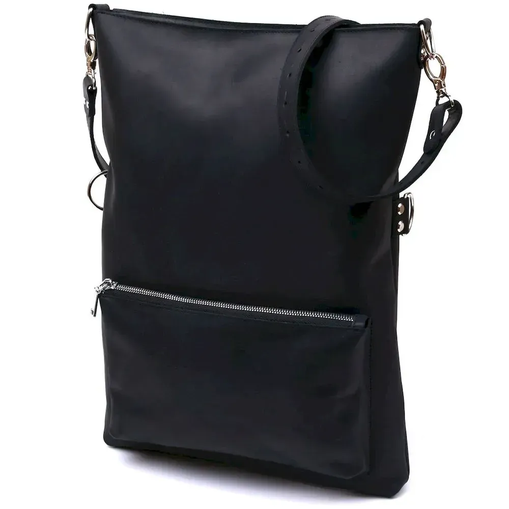 Жіноча сумка в цікавому небанальний дизайн від українського виробника. Матеріал виготовлення – натуральна шкіра з відмінними показниками міцності та стійкості до різного роду зносу. Колір сумки – універсальний чорний, фактура – матова гладка. Внутрішнє відділення дуже просторе та містке, на зовнішній стороні є накладна невелика кишеня.