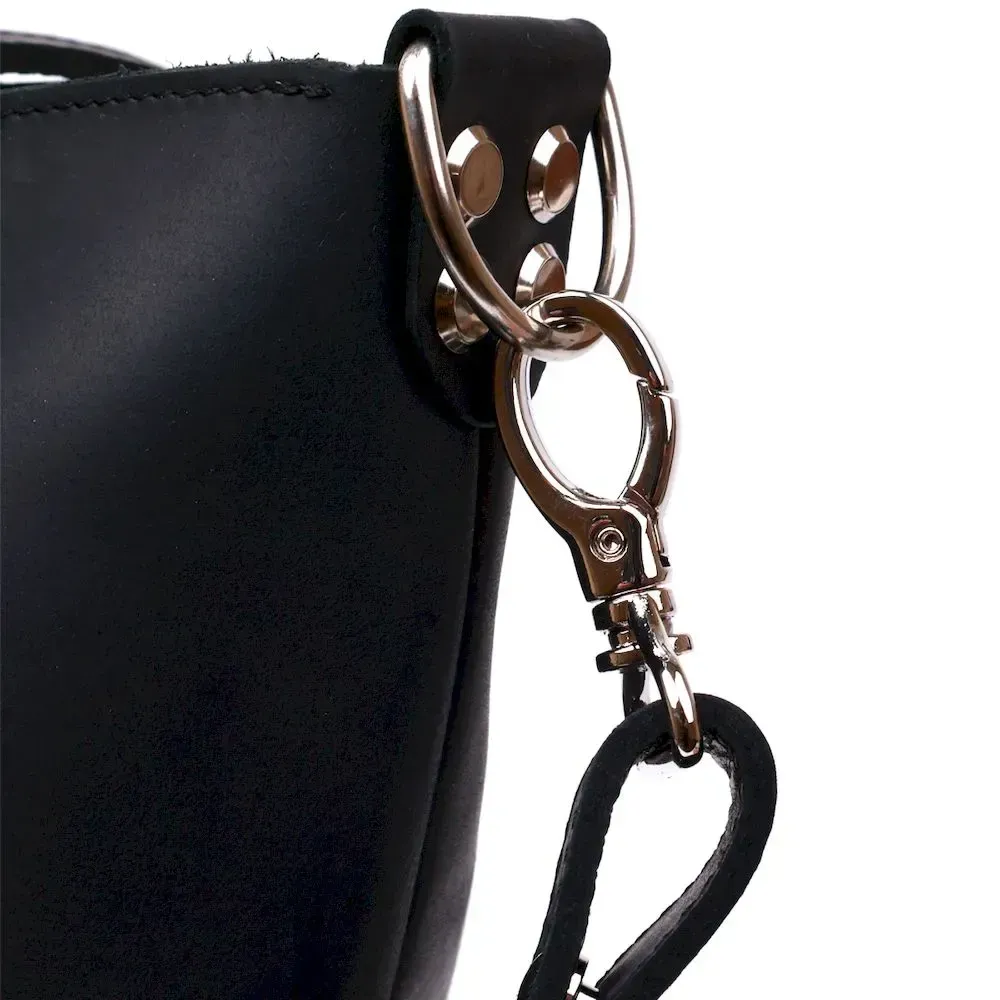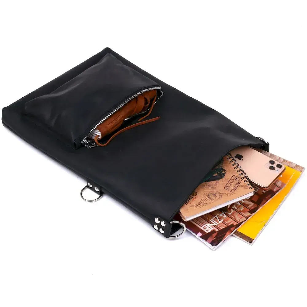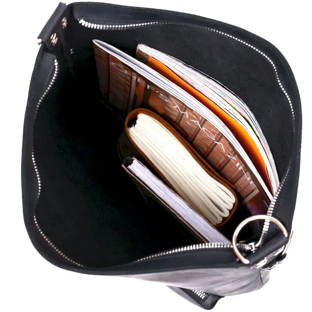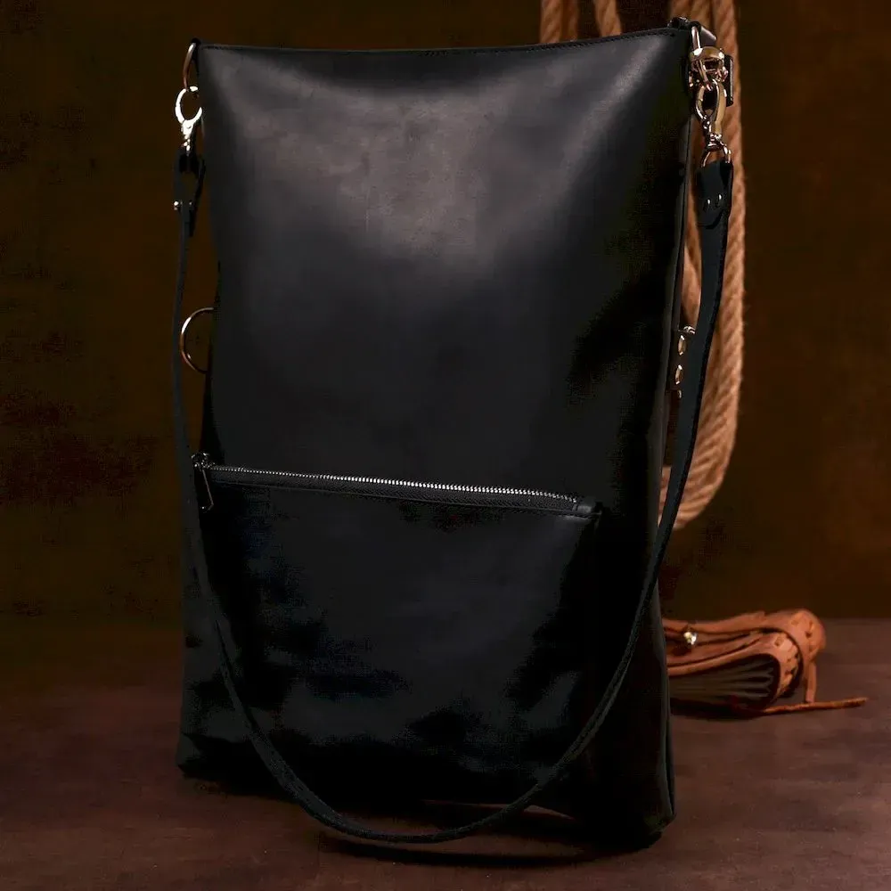 Жіноча сумка в цікавому небанальний дизайн від українського виробника. Матеріал виготовлення – натуральна шкіра з відмінними показниками міцності та стійкості до різного роду зносу. Колір сумки – універсальний чорний, фактура – матова гладка. Внутрішнє відділення дуже просторе та містке, на зовнішній стороні є накладна невелика кишеня.