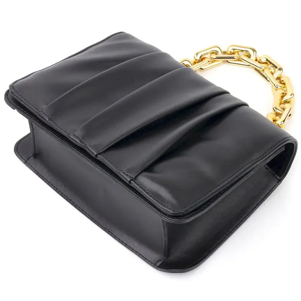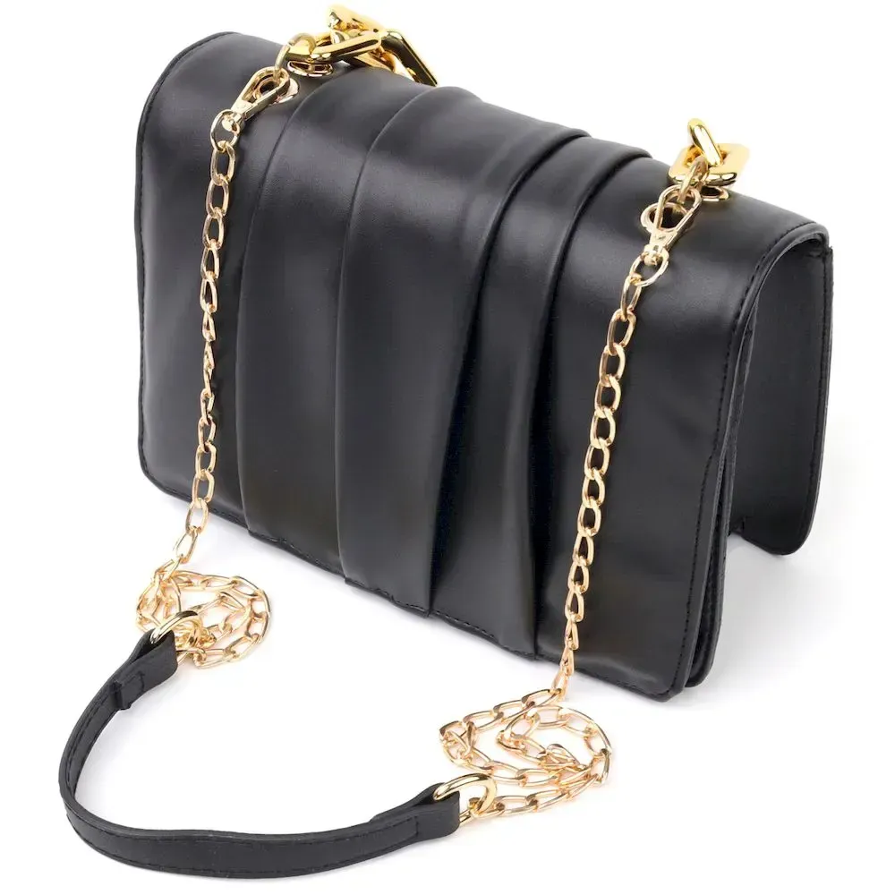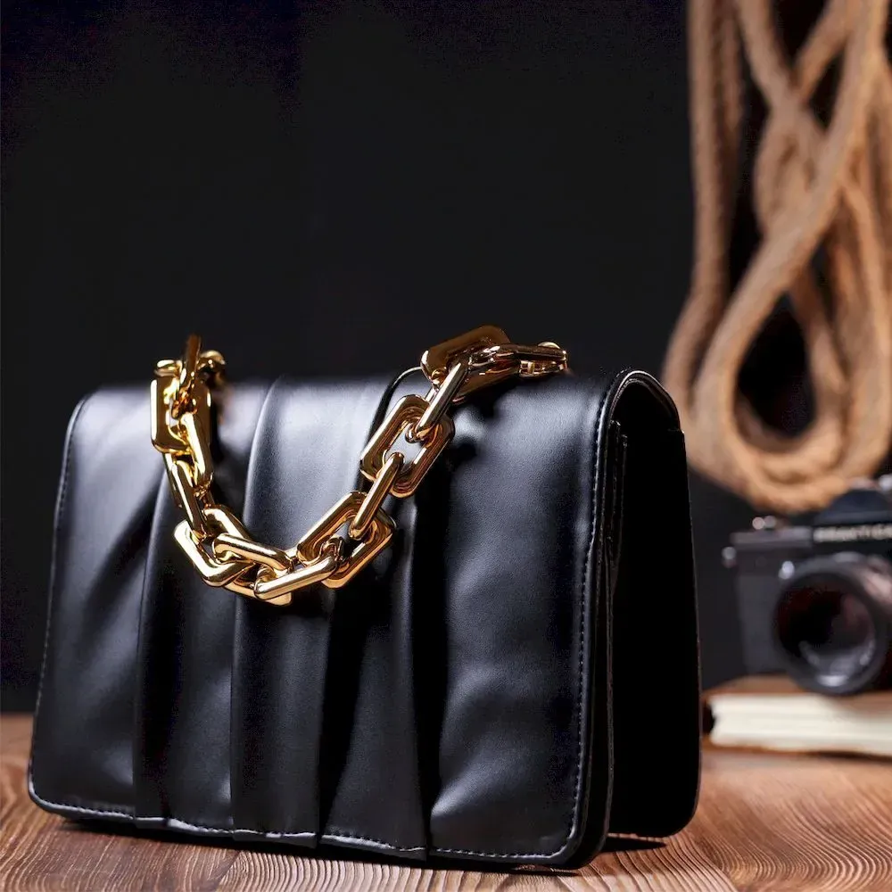 Чудова сумка чорного кольору з якісної еко-шкіри. Сумка має стильний дизайн, красиву пластикову ручку-ланцюжок, для перенесення в руці, а також ремінь, що регулюється, з металевого ланцюжка і вставки з еко-шкіри. Модель довгий час залишається у ідеальному стані, таку сумку приємно носити. Може бути чудовим варіантом для подарунка стильній жінці.