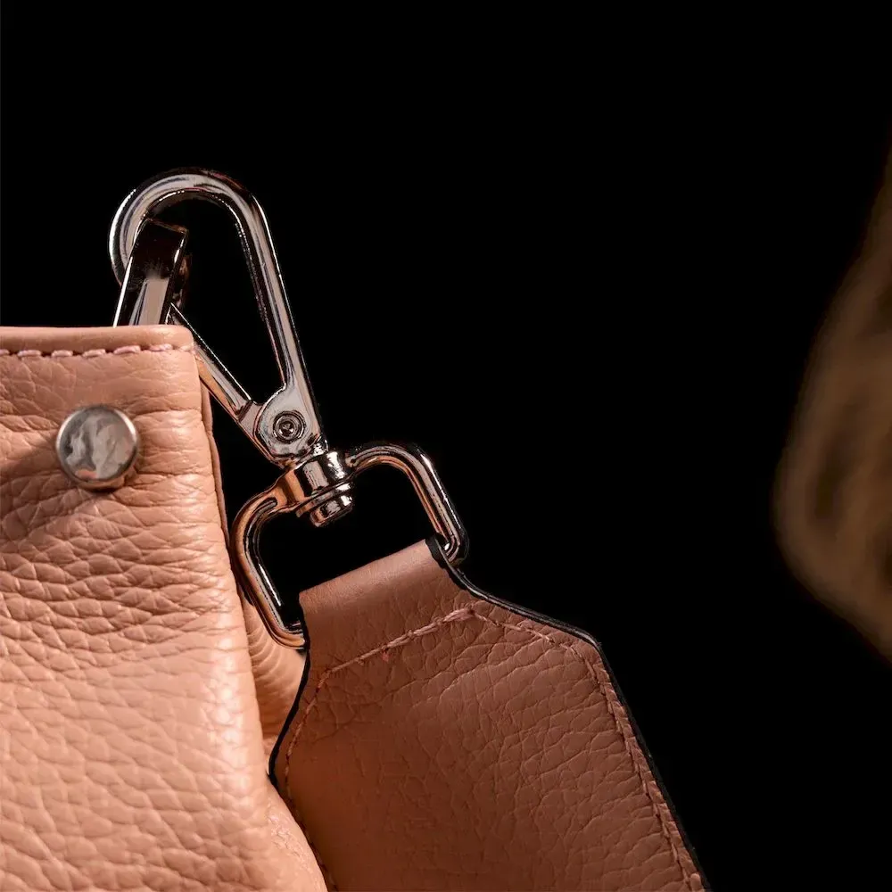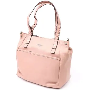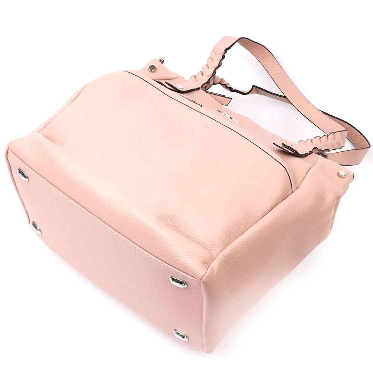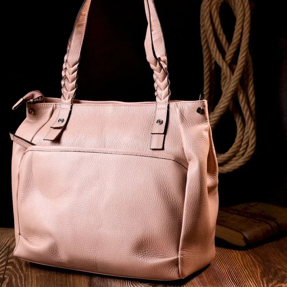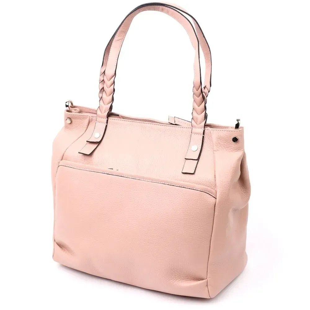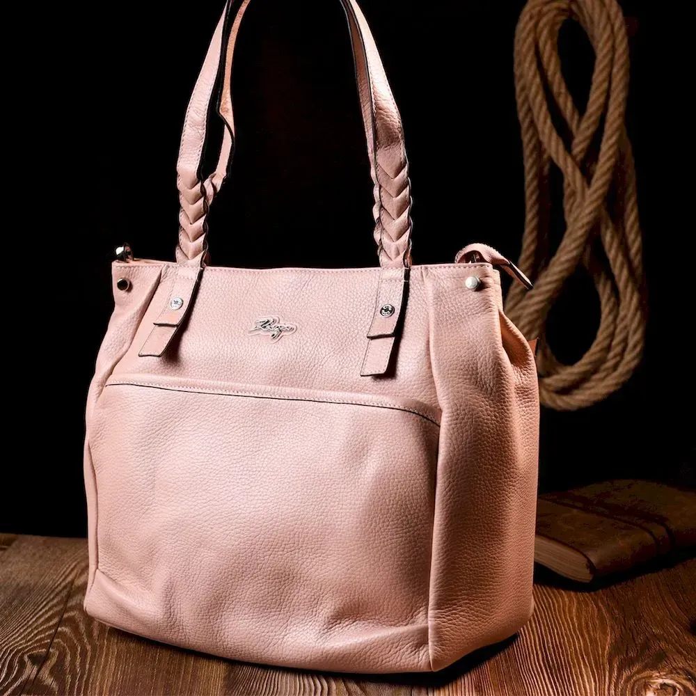 Надміцна жіноча сумка-шоппер з дрібнозернистої натуральної шкіри, в ніжному пудровому кольорі. Сумка функціональна та міцна, відмінний варіант для щоденного користування. У виробі використана якісна фурнітура сріблястого кольору, яка не тільки доповнює стильний дизайн сумки, але й захищає виріб. Шоппер має міцну підкладку. Аксесуар упакований у фірмовий текстильний мішок Karya. Сумка з натуральної шкіри завжди буде чудовим подарунком будь-якій жінці.