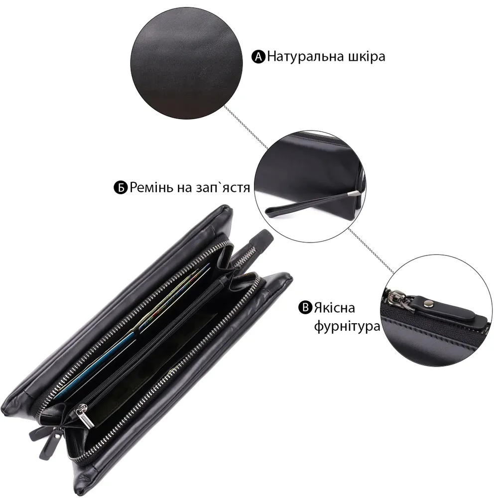 Клатч оснащений не знімним шкіряним ремінцем для зап'ястя (кистовим), що дозволяє комфортно носити виріб на руці, звільняючи долоні. Це не тільки практично, але й надає образу завершеності та стилю.