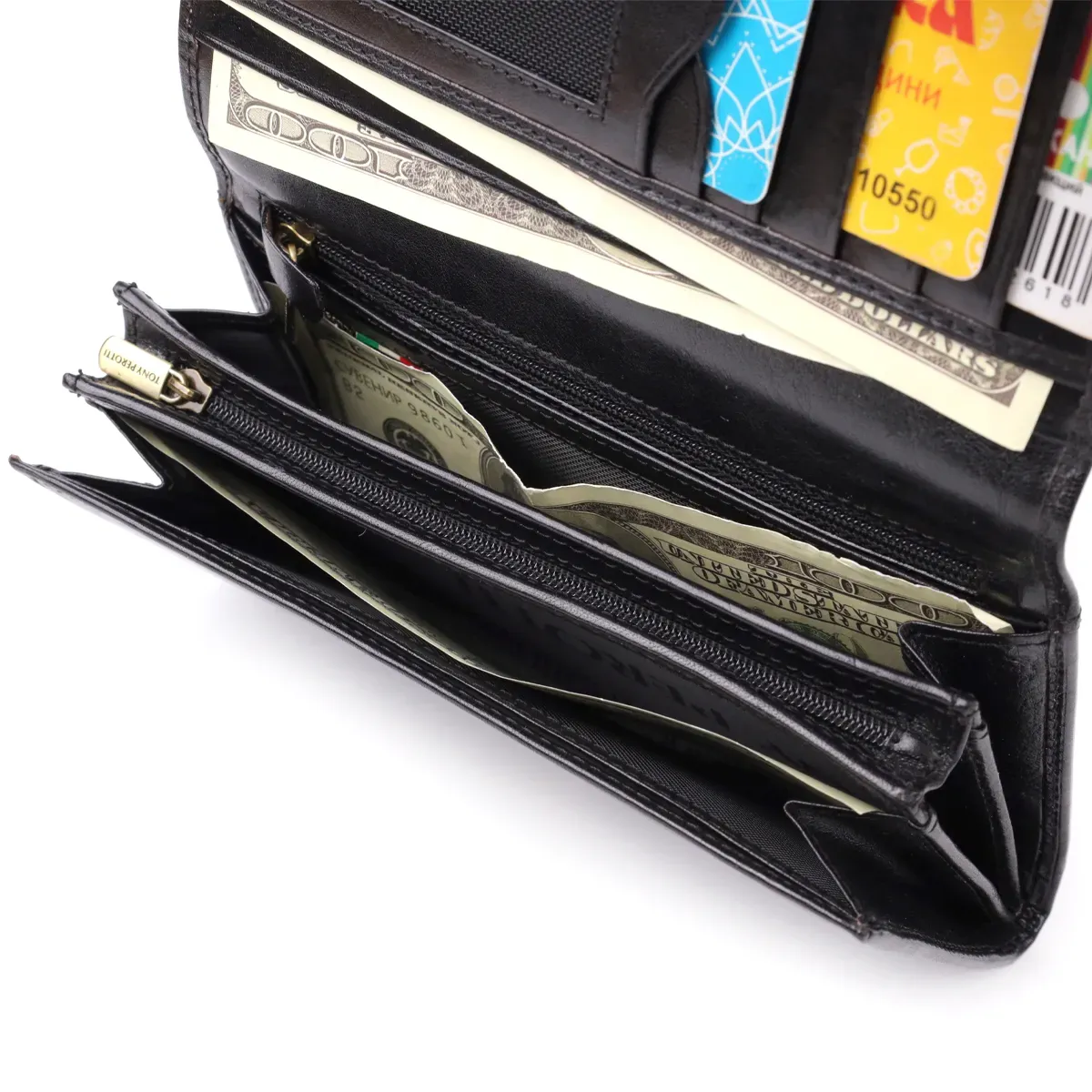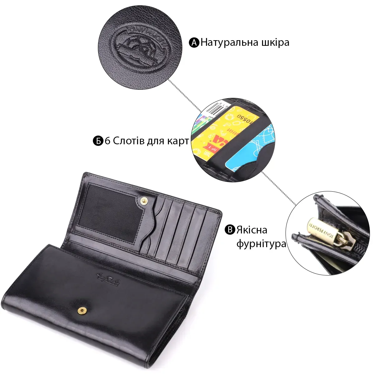 Класичний портмоне Tony Perotti у чорному кольорі поєднує елегантний дизайн, функціональність та високу якість виконання. Продумана організація внутрішнього простору дозволяє зручно зберігати купюри, документи, карти та дріб'язок, а брендована фурнітура та тиснений логотип підкреслюють преміальний рівень виробу. Портмоне стане універсальним аксесуаром та чудовим подарунком.