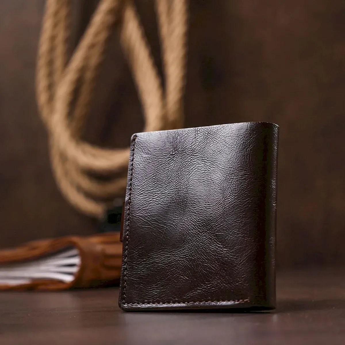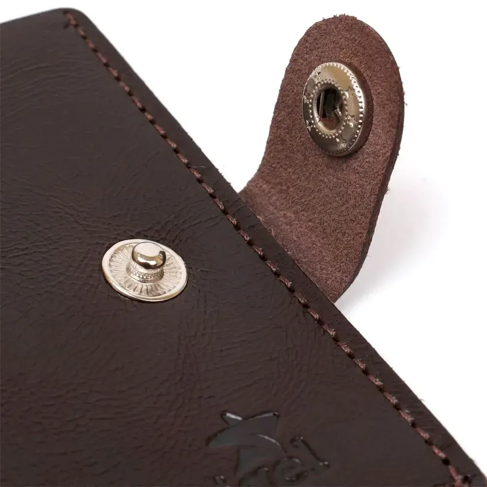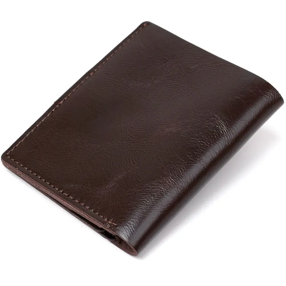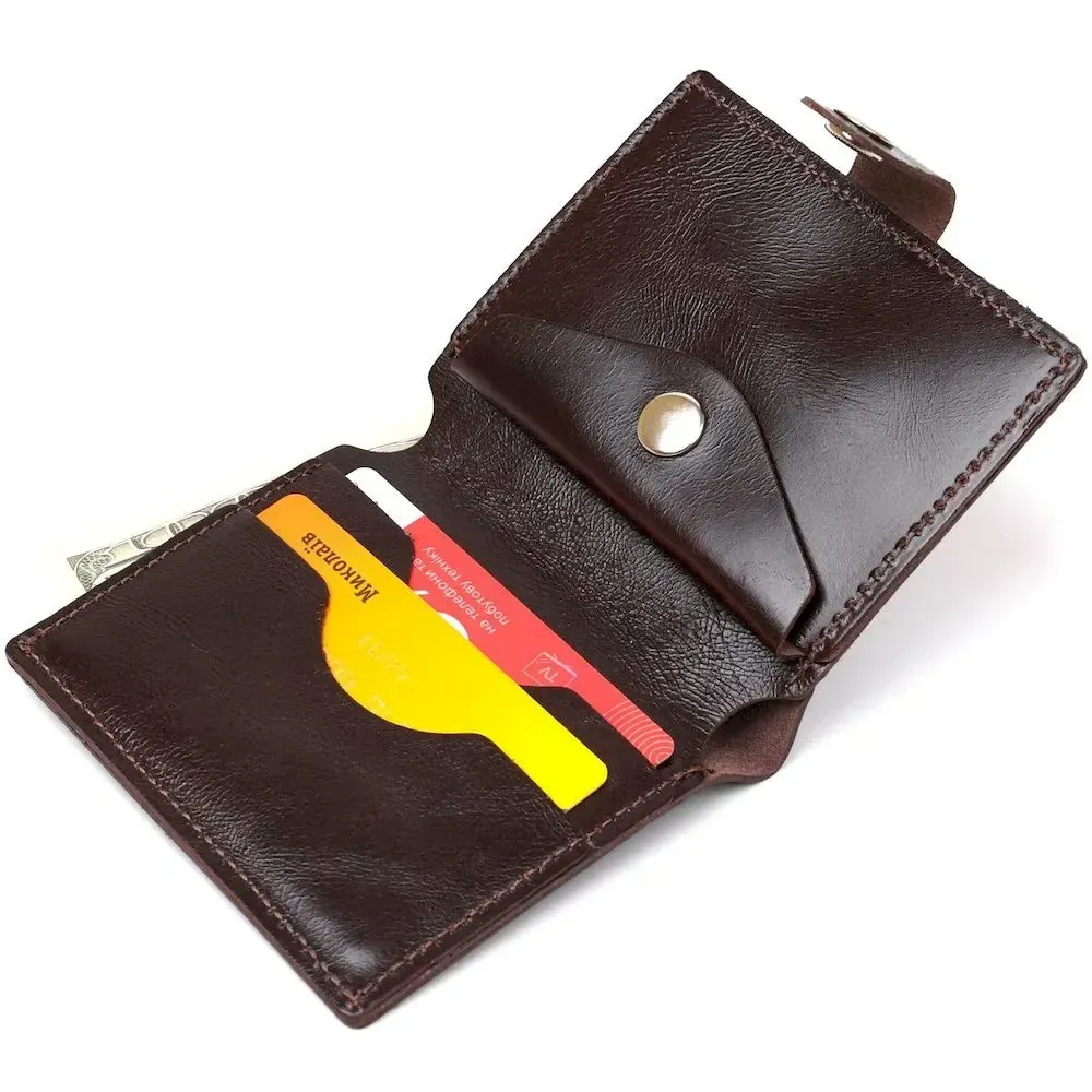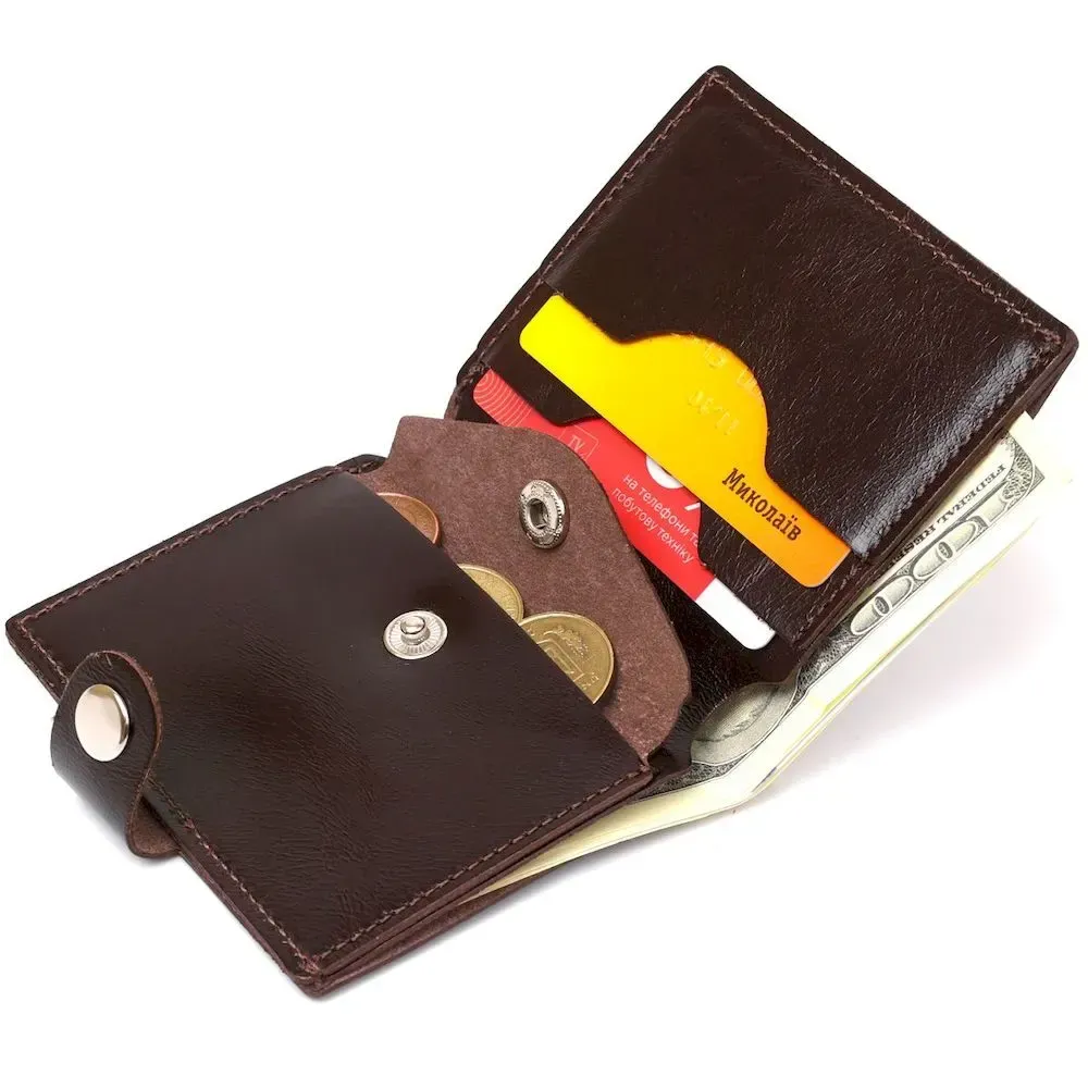 Стильний чоловічий портмоне від українського виробника у стриманому класичному дизайні. Виготовлений гаманець з натуральної шкіри високої якості та підвищеної опірності до зносу. Усередині є містке відділення для купюр, слоти для пластикових карток та невелика монетниця на кнопці. Колір аксесуара – коричневий з легким переливом, фактура – гладка.