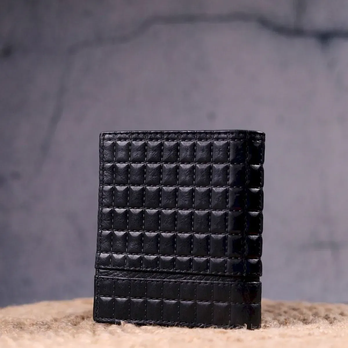 Класичний чоловічий гаманець, з натуральної стьобаної шкіри, в класичний чорний колір. Усередині знаходиться два відділення для купюр, шість відділень для карт, три приховані кишені та монетниця на кнопці. Закривається гаманець у два додавання без застібки. Вироби з натуральної шкіри завжди будуть чудовим подарунком для близької людини.