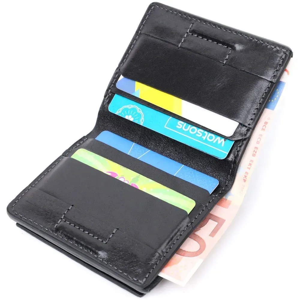 Чоловіче класичне портмоне з італійської натуральної гладкої шкіри найвищої якості. Аксесуар має компактний розмір та витриманий строгий дизайн. Портмон легко поміститься в кишеню штанів або маленьку сумку. По краях виріб прошито рівним чорним рядком у дизайн виробу. Портмоне буде ідеальним подарунком для близької людини. У комплекті йде фірмовий тканинний чохол.