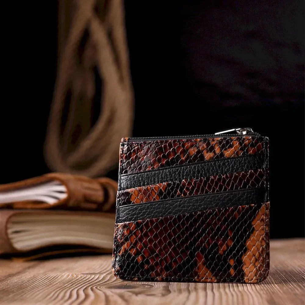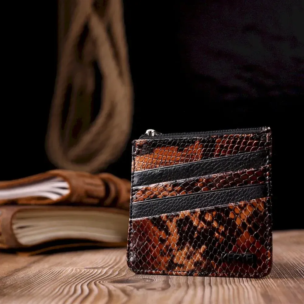Гарний картхолдер із комбінації двох видів натуральної шкіри, зернистої та з тисненням під змію. Аксесуар упакований у фірмову коробочку. Вироби з натуральної шкіри завжди будуть чудовим подарунком для близької людини.