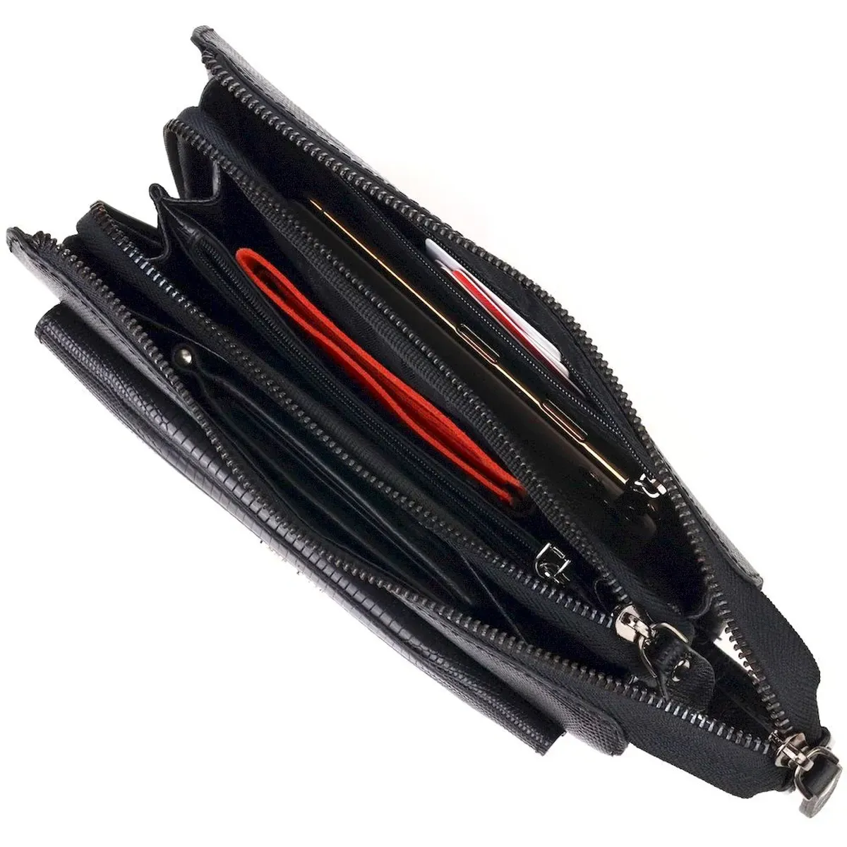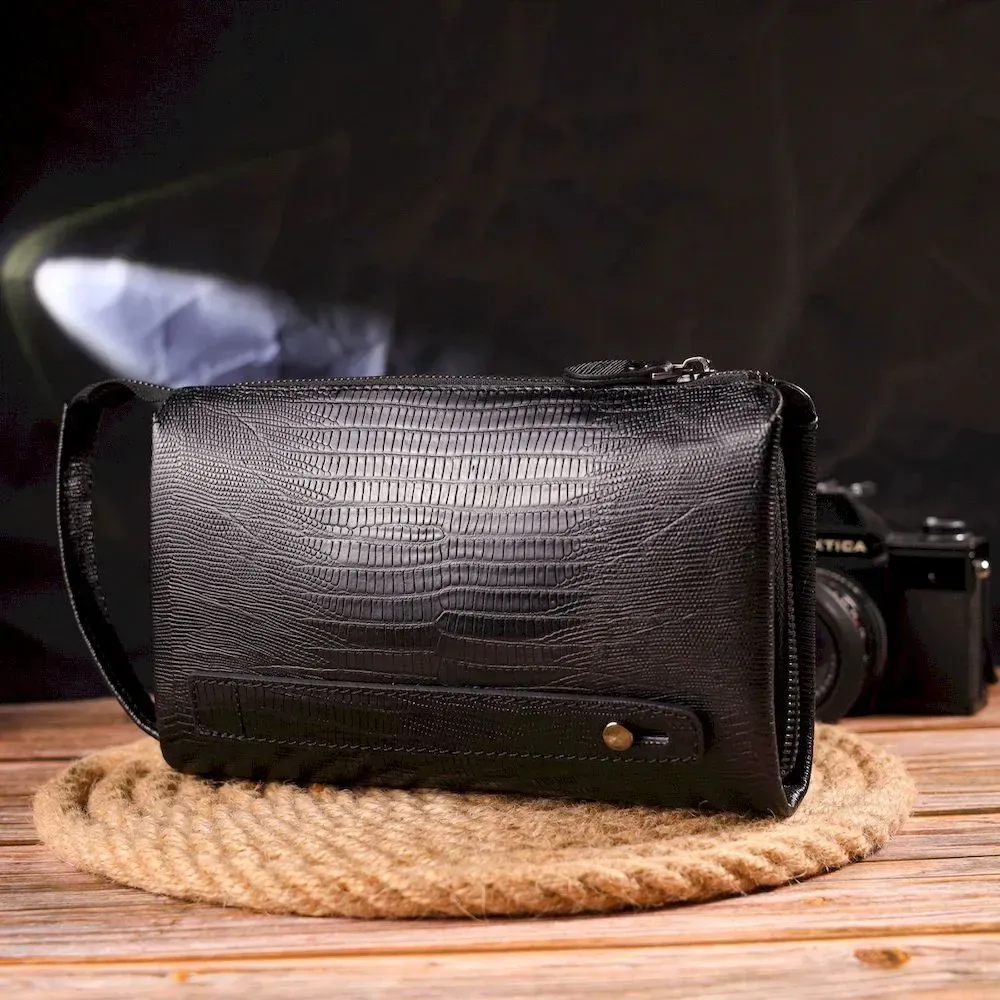 Ультрамодний місткий клатч для чоловіків з натуральної якісної шкіри з тисненням під рептилію. Аксесуар має одне основне відділення, всередині якого дві бічні кишені, одна з них на блискавці та кишеня-перегородка на блискавці. Зовні у виробі розташовані дві кишені на лицьовій та тильній стороні. Внизу аксесуара є ремінець для носіння на руці, що дуже зручно у використанні, також є незнімна ручка. Чим зручний клатч - у нього Ви можете покласти все необхідне і все буде під рукою.