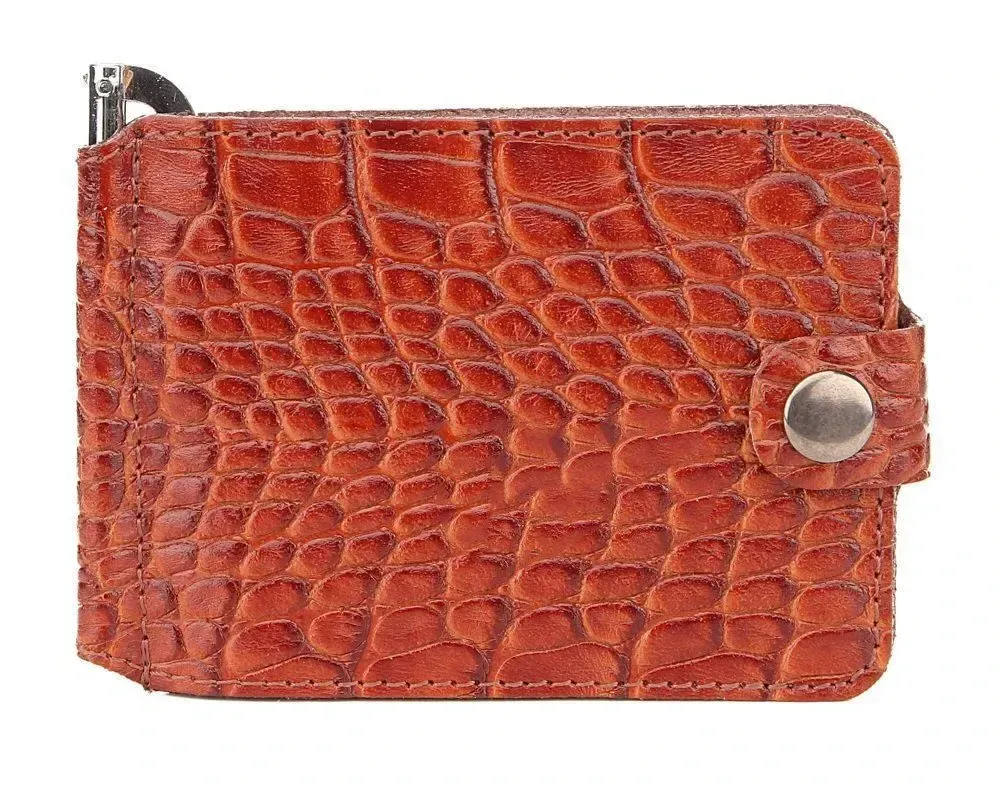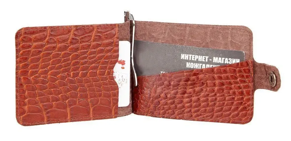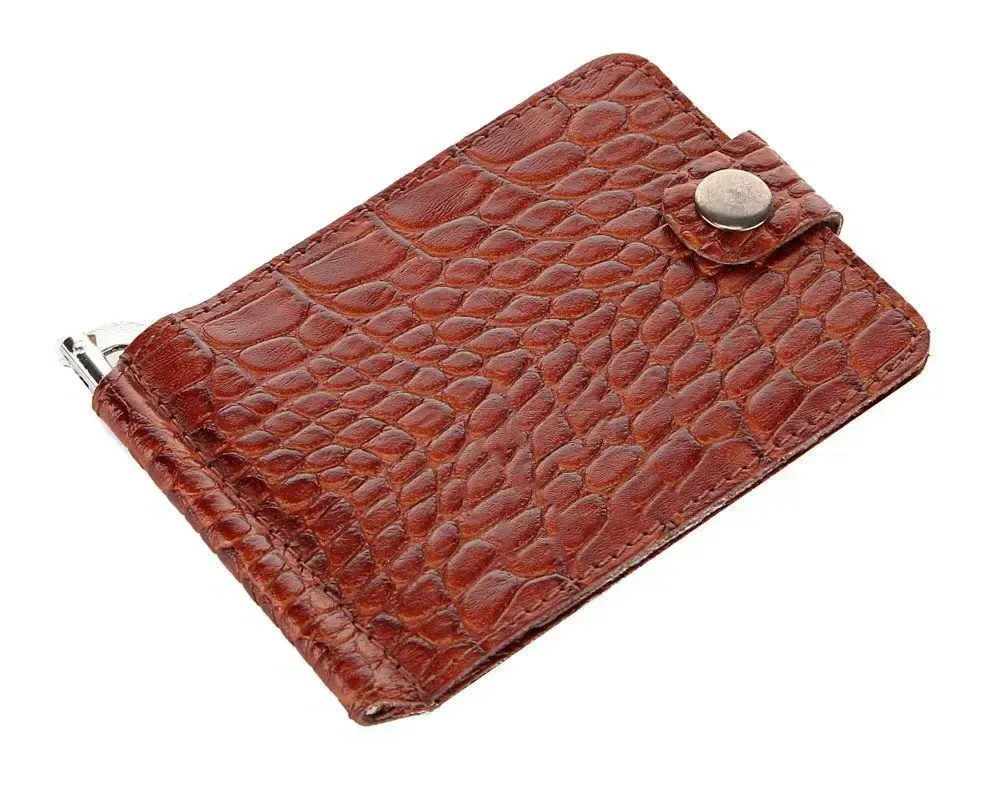 Розкішний затискач для купюр, кольору коньяку виготовлений з натуральної шкіри високої якості з тисненням під шкіру крокодила. Складається аксесуар з: