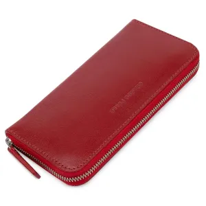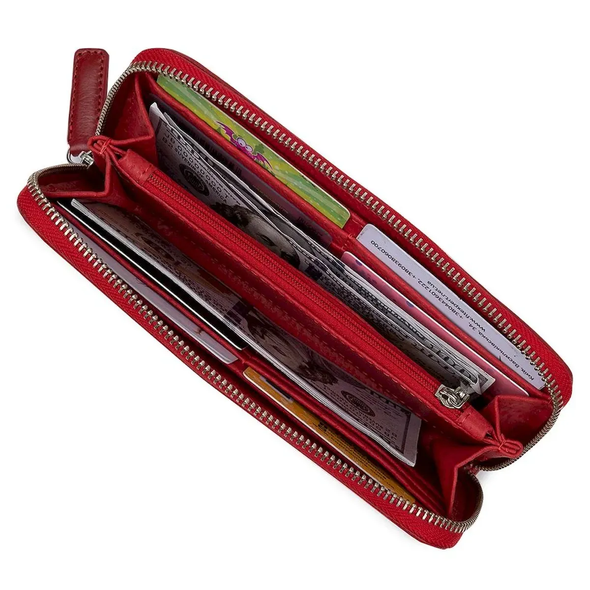 Чудовий гаманець для жінок у соковитому червоному кольорі. Матеріал виготовлення – висококласна натуральна шкіра, яка стійка до зношування. Поверхня гладка без особливого блиску. Усередині є місткі відділення, кишені для візитних та кредитних карток та монетниця на блискавці. Запакований аксесуар у фірмову картонну коробку.
