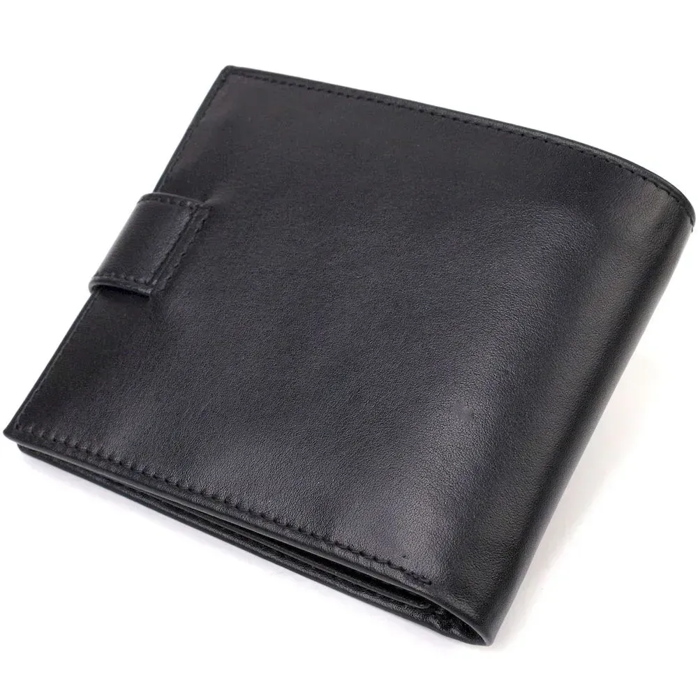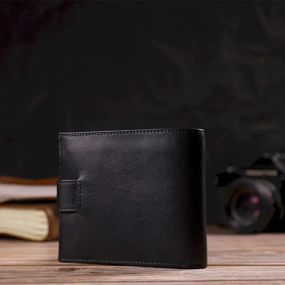 Класичний чоловічий гаманець з натуральної гладкої шкіри. Аксесуар має основне відділення для купюр, три осередки для карток, дві кишені під сіточкою, кишеню на блискавці через усю довжину та монетницю, що закривається клапаном на кнопку. Гаманець складається навпіл і закривається хлястиком на кнопку. На лицьовій стороні в правому нижньому кутку розташований металевий логотип компанії виробника. Багатофункціональний чоловічий гаманець з дуже міцної шкіри чудовий вибір подарунка для солідного чоловіка.